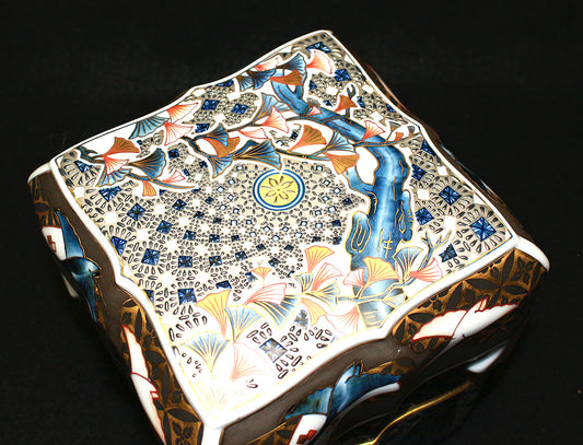 25316 Living National Treasure 14th Generation Imaizumi Imaemon (Colored Snowflake Ink Splashing Chinese Flower Chinzasa Design Black Tea Bowl)