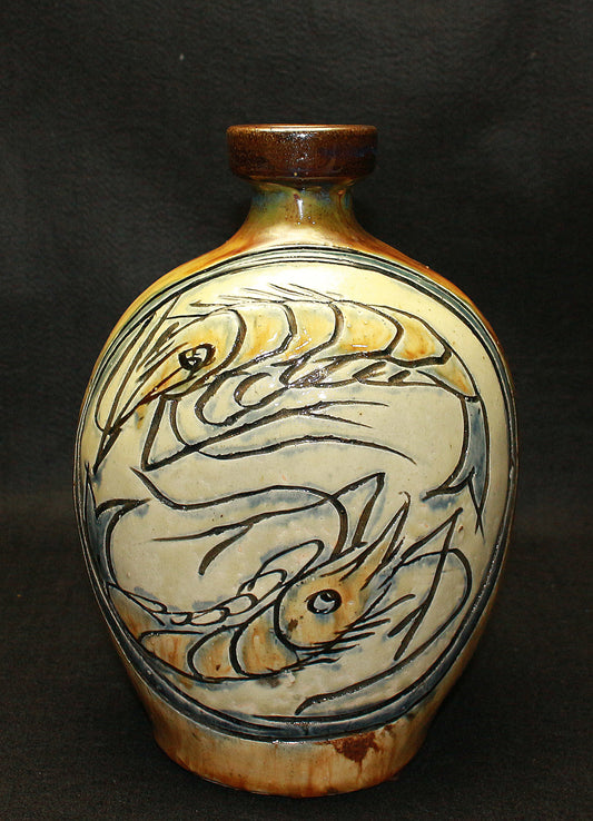 26172 Living National Treasure Jiro Kinjo Sake Bottle with Shrimp and Fish Motif KINJO Jiro