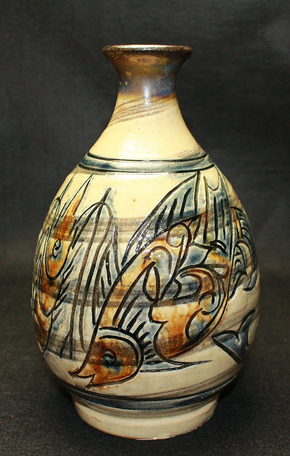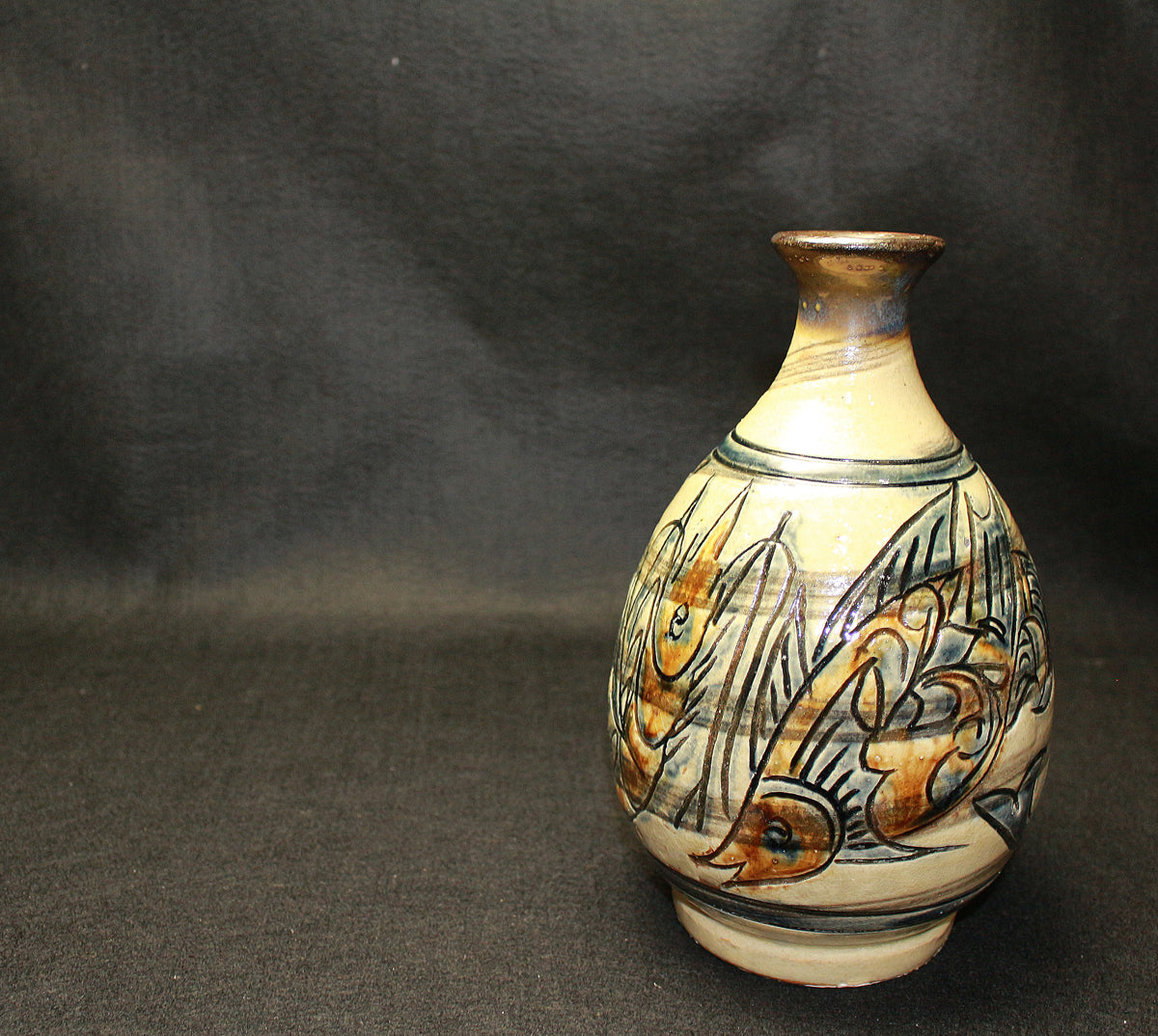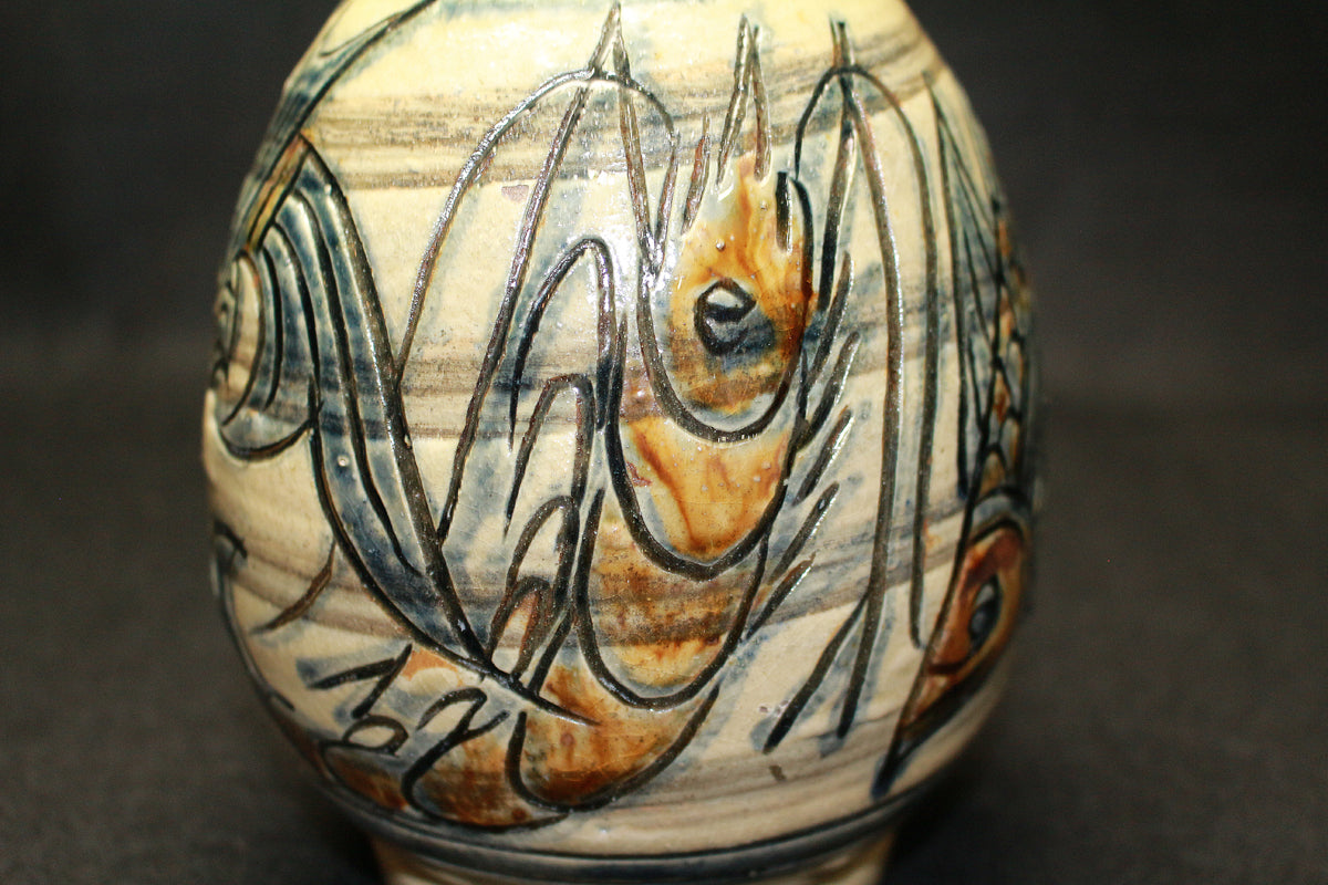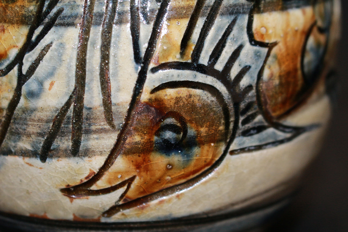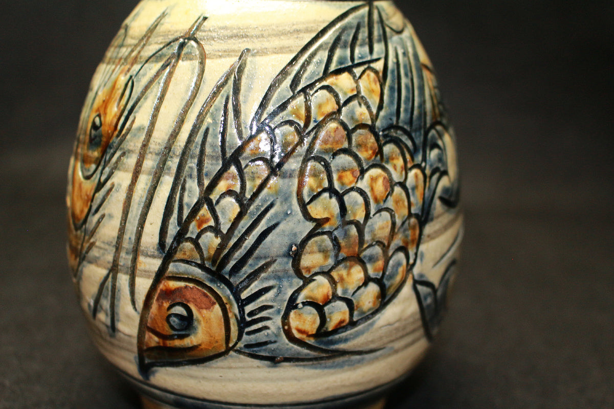 特に「笑う魚」など、ユーモラスな表情の魚紋は金城作品の象徴的な絵柄とされており、作品に温かみを与えています。彼は、沖縄の伝統である琉球陶器の再現を目指し、浮彫り技法を用いて抽象化された魚や海老の意匠を取り入れ、独自の温かい陶芸を生み出しました。