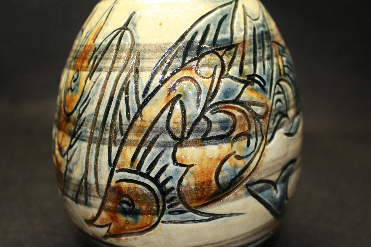 金城次郎の作品に登場する「魚紋」は、魚がたくさんの卵を産むことから子孫繁栄を意味する縁起の良い文様として親しまれています。