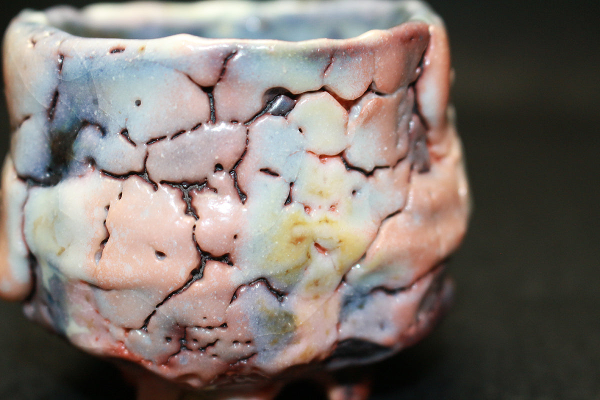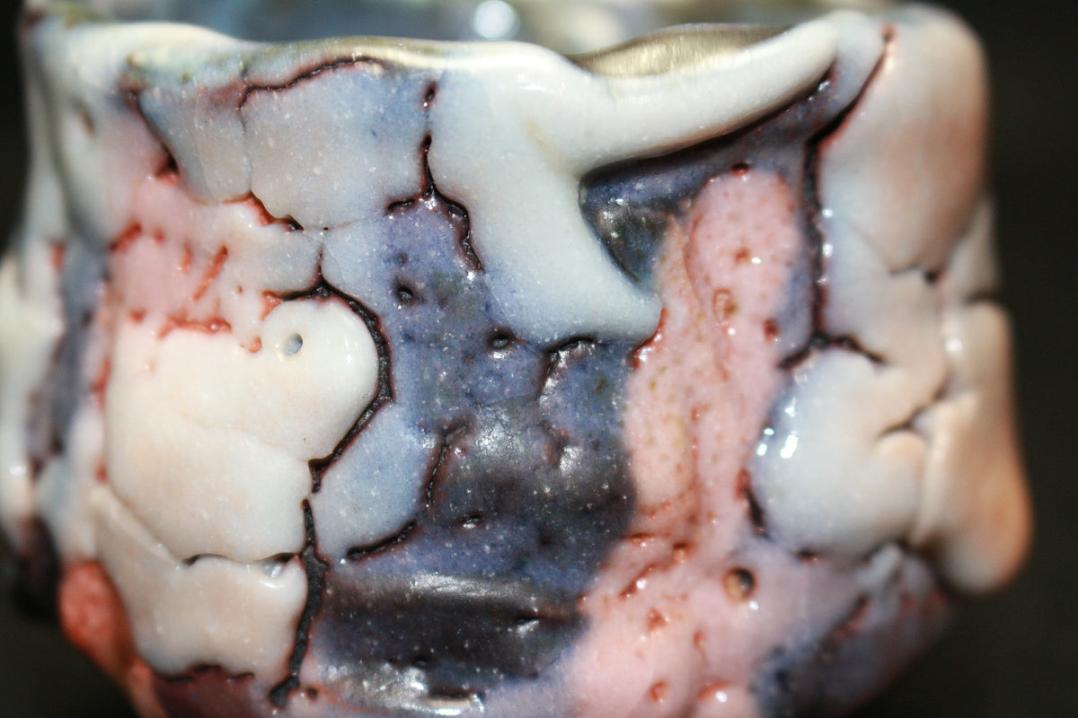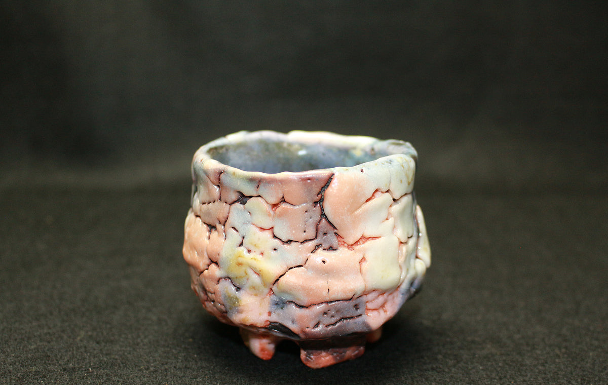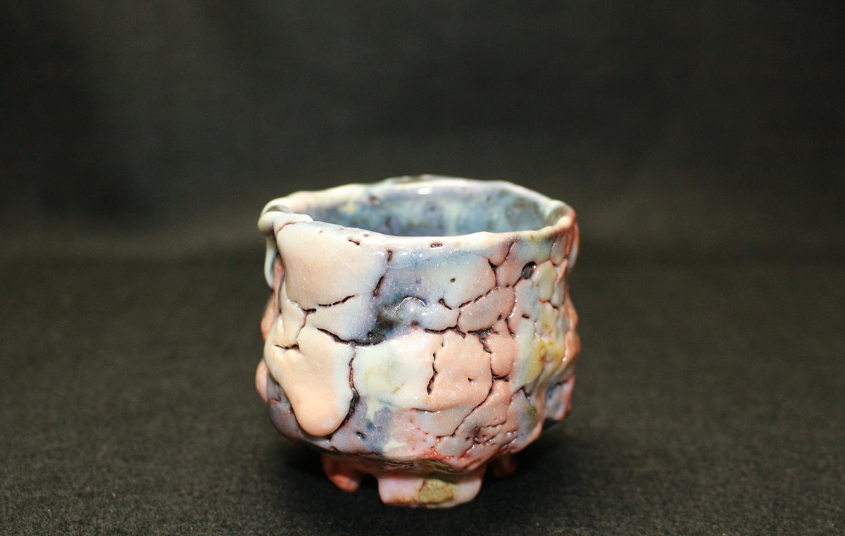 自身の作品づくりの原点とするのは、土岐市内で開催された展覧会でみた、桃山時代の名碗・重要文化財《鼠志野茶碗 銘峯紅葉》(五島美術館蔵)だという。この桃山時代の鼠志野を基本に、鼠志野に灰被りした状態の色合いをつくり出すべく、色々な鉱物を混ぜ、焼成方法と釉薬の掛け合わせなどを研究している。