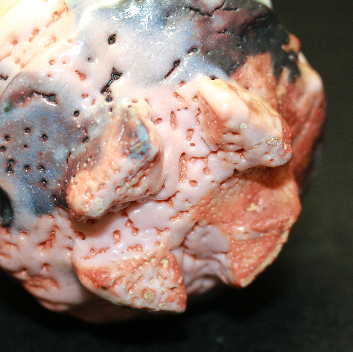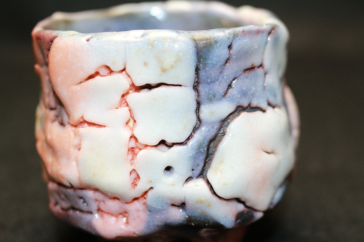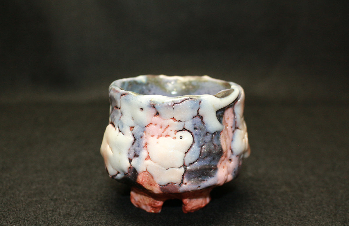 自身の作品づくりの原点とするのは、土岐市内で開催された展覧会でみた、桃山時代の名碗・重要文化財《鼠志野茶碗 銘峯紅葉》(五島美術館蔵)だという。この桃山時代の鼠志野を基本に、鼠志野に灰被りした状態の色合いをつくり出すべく、色々な鉱物を混ぜ、焼成方法と釉薬の掛け合わせなどを研究している。