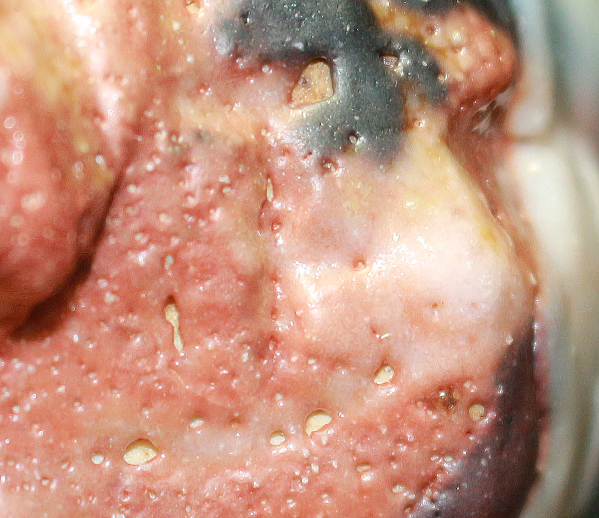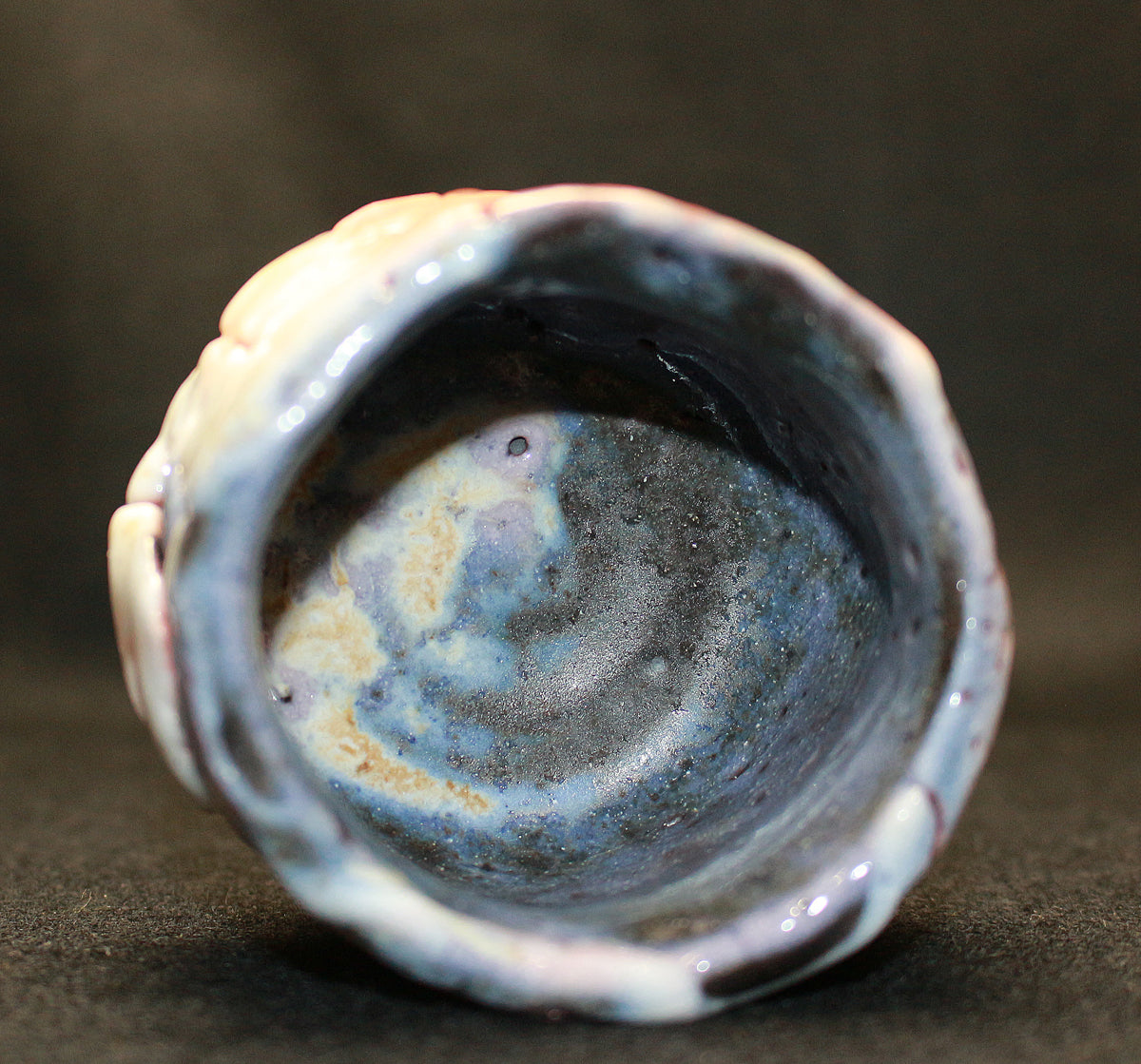 本作は、深い藍色の地に厚く掛かる白い釉薬にはほのかに赤く発色する部分も現れるなど複雑な色合いをみせ、割高台は力強い大胆なフォルムをつくりだして、まさに「正太郎志野」を表す作品となっている。