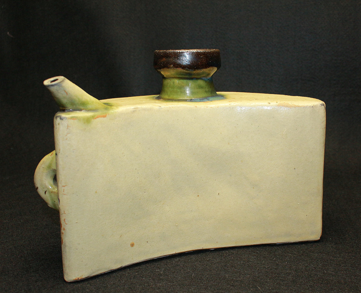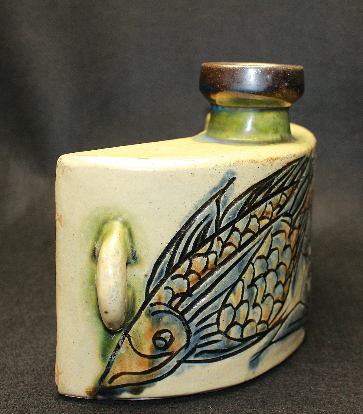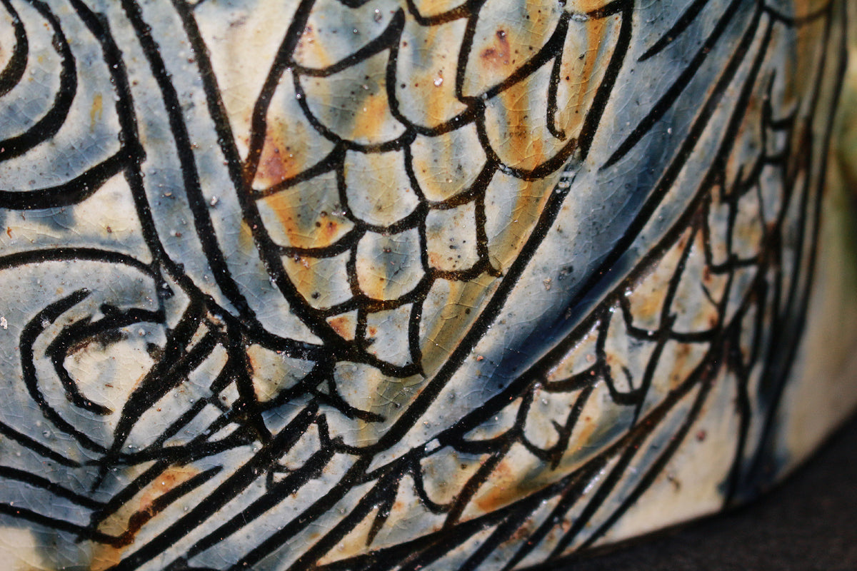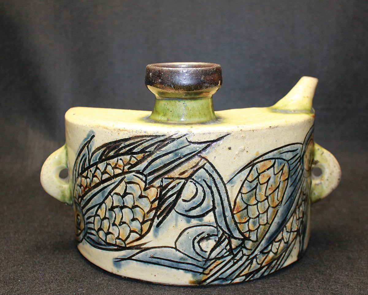 人間国宝 金城次郎の作品です。 沖縄の造形美を代表する伝統的な酒器であり、現在でも非常に人気の高い抱瓶です。得意の線彫魚文は、魚を見事に表現しています。出来も良く希少な逸品です。