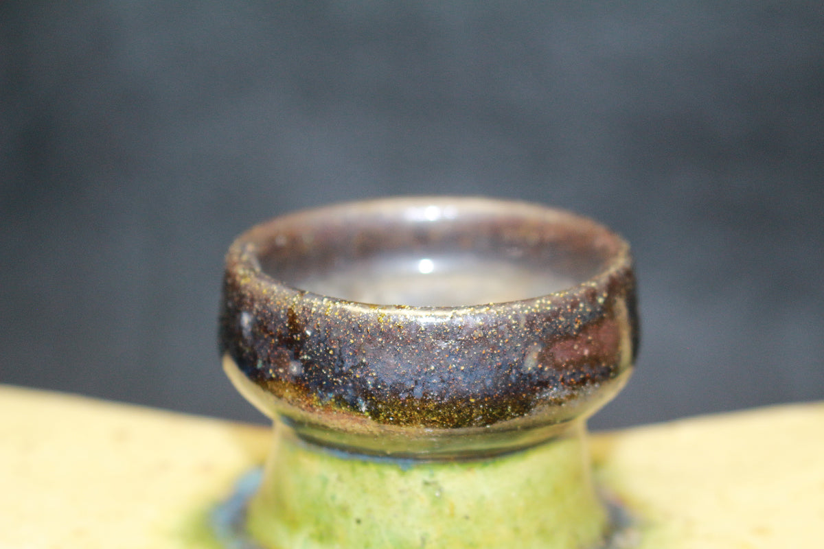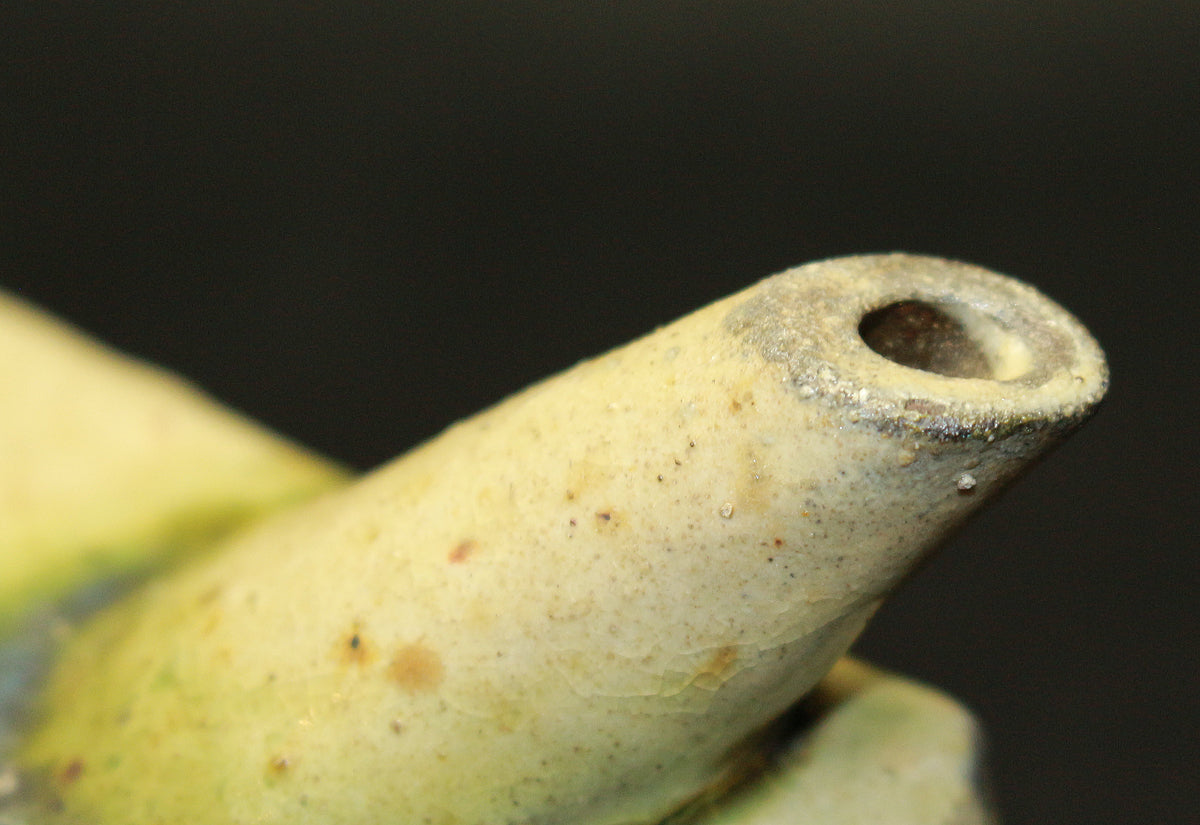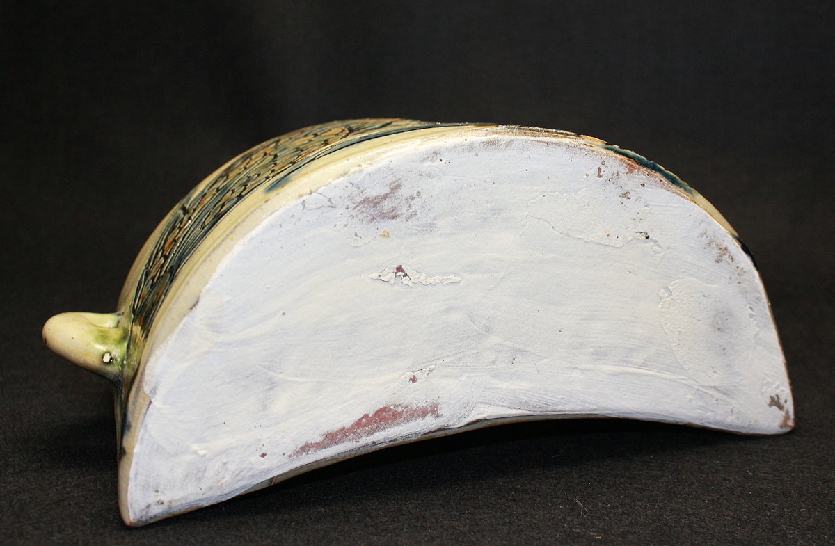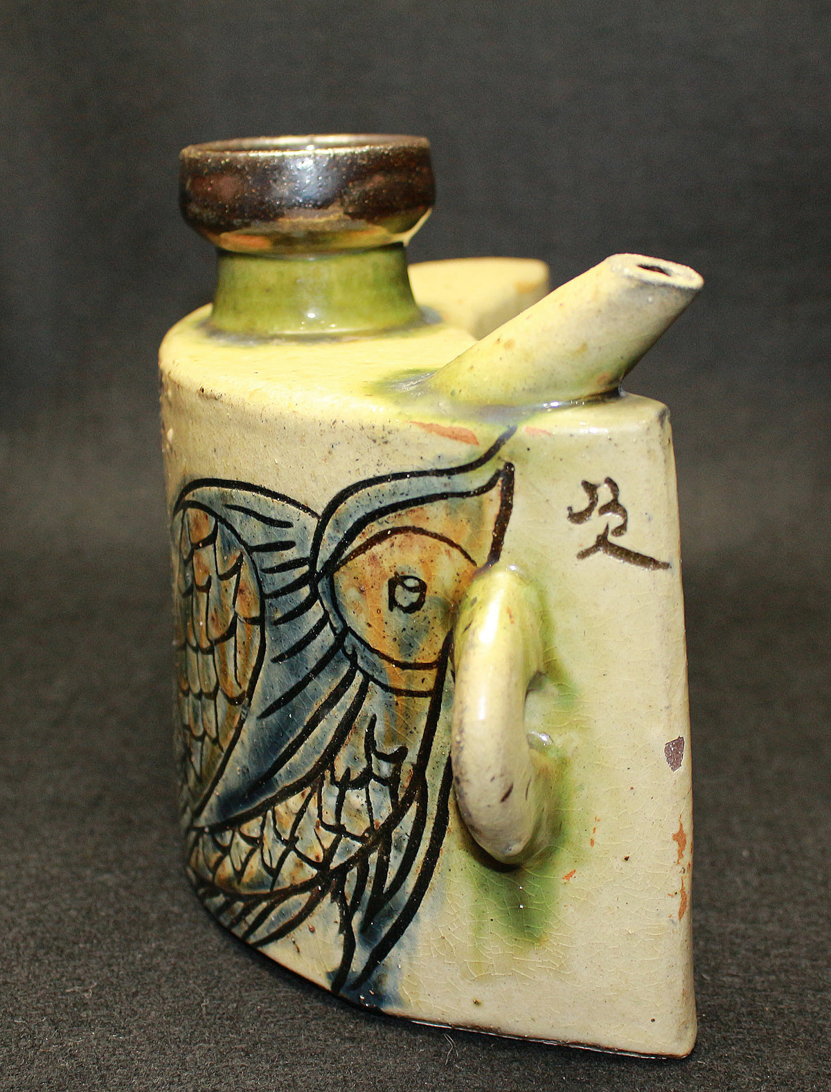 人間国宝 金城次郎の作品です。 沖縄の造形美を代表する伝統的な酒器であり、現在でも非常に人気の高い抱瓶です。得意の線彫魚文は、魚を見事に表現しています。出来も良く希少な逸品です。