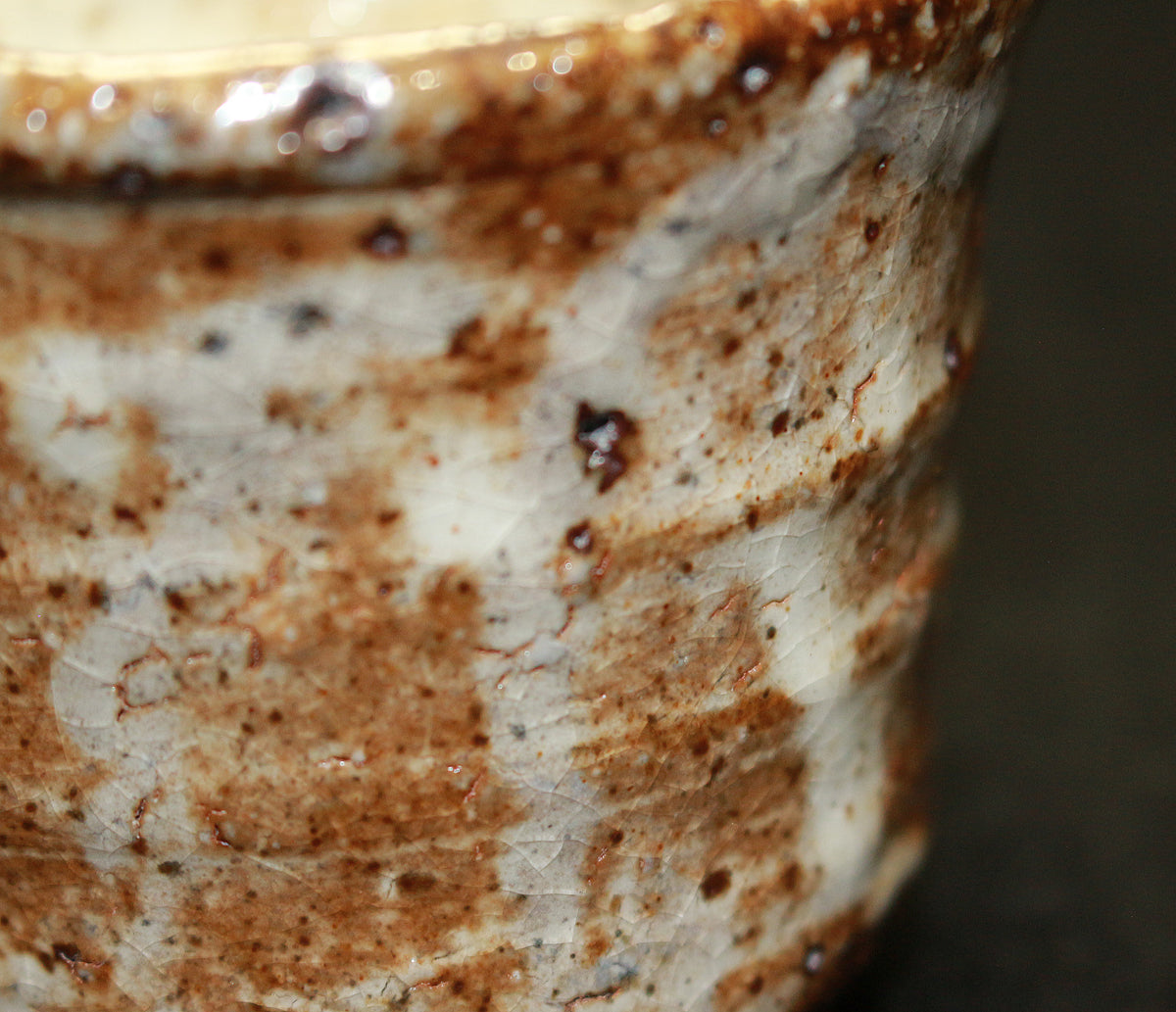 Shizenbo's Kohiki Karatsu ware ranges from clean white pieces to those with a rustic character due to the effects of the kiln during firing (kiln transformation), showcasing a diverse range of styles. Furthermore, the aging process allows you to enjoy the unique changes that occur over time, such as the distinctive "rain leak" pattern that develops with continued use.