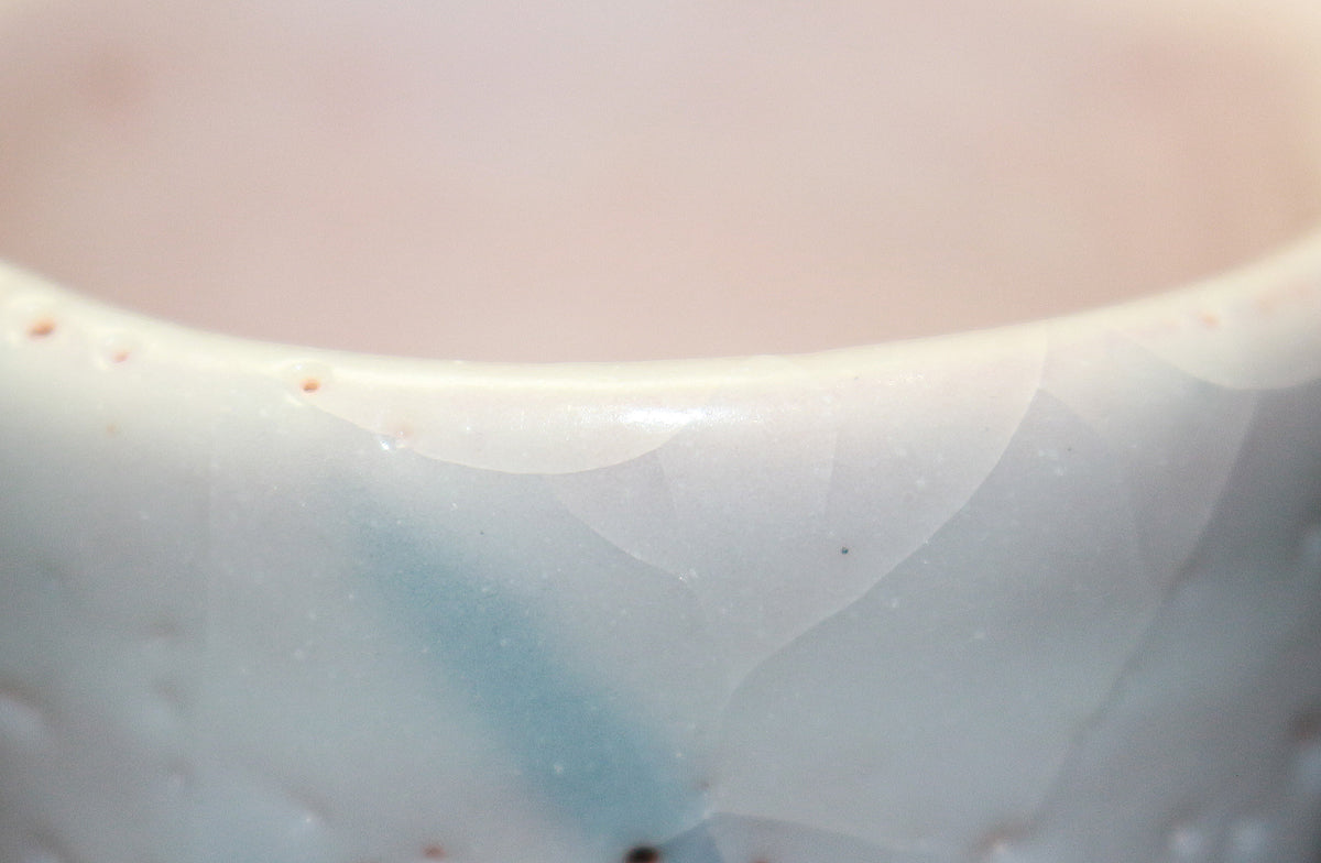 近現代志野の大巨匠である「荒川豊蔵」に師事し、桃山美濃を深く追求して半地上型穴窯により伝統的な志野、黄瀬戸、瀬戸黒などの秀作を生み出し続ける人間国宝【加藤孝造】の作。孝造ならではの実に美しい志野作品で、美しい色合いが抜群の風合いをみせ、作者の高い力量が存分に発揮されています。 美しい桃色の釉に垣間見える胎土の緋色、さらには鑑賞性優れる見事な器形、美しくも品位ある景色を誇る素晴らしい志野作品です。