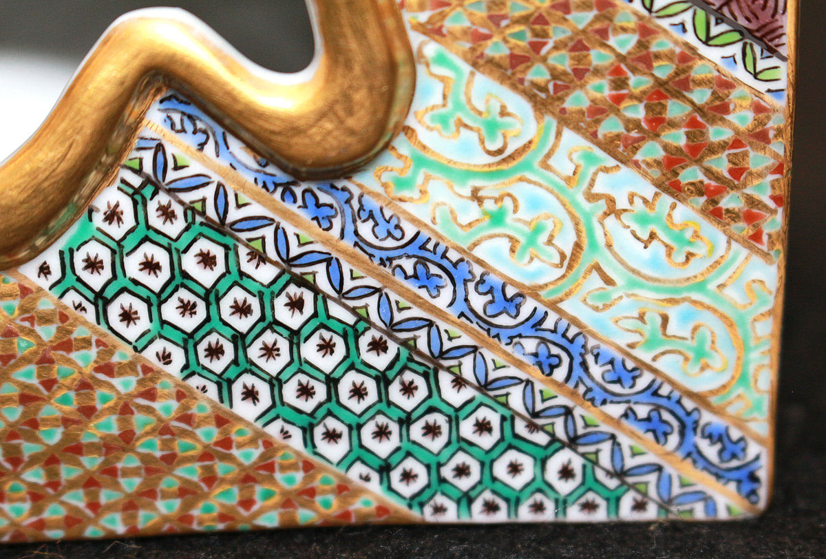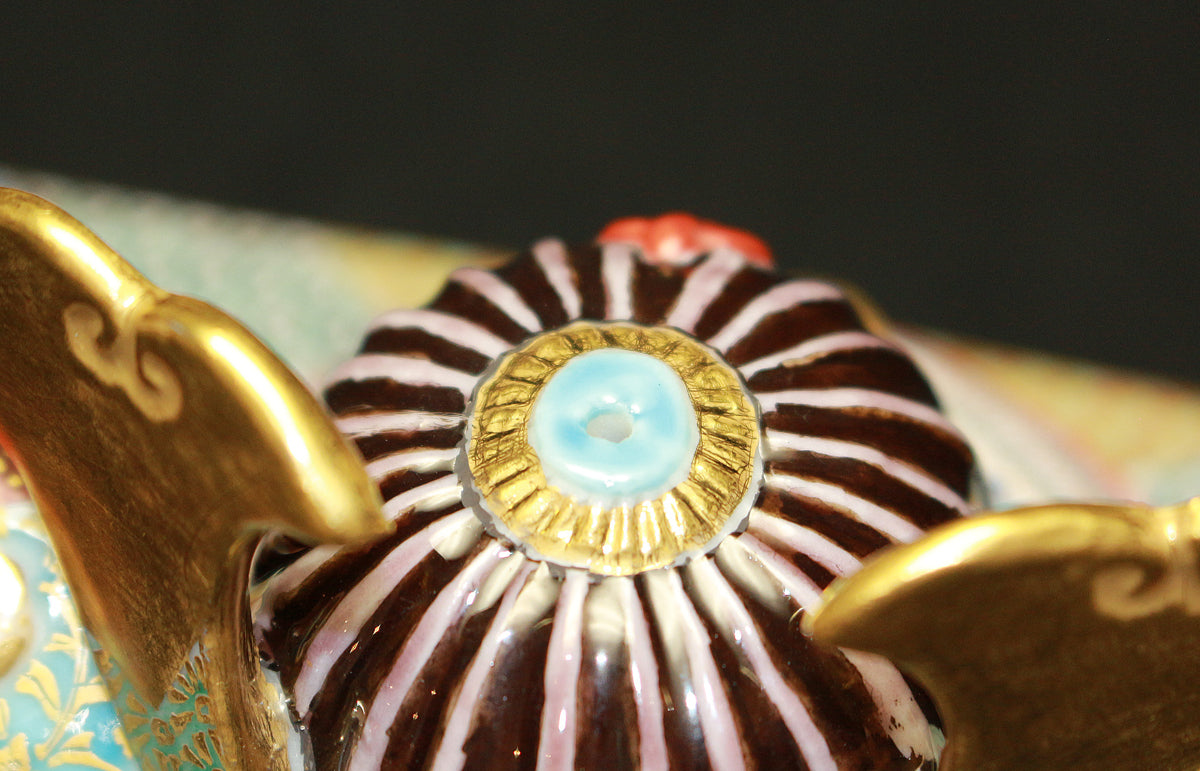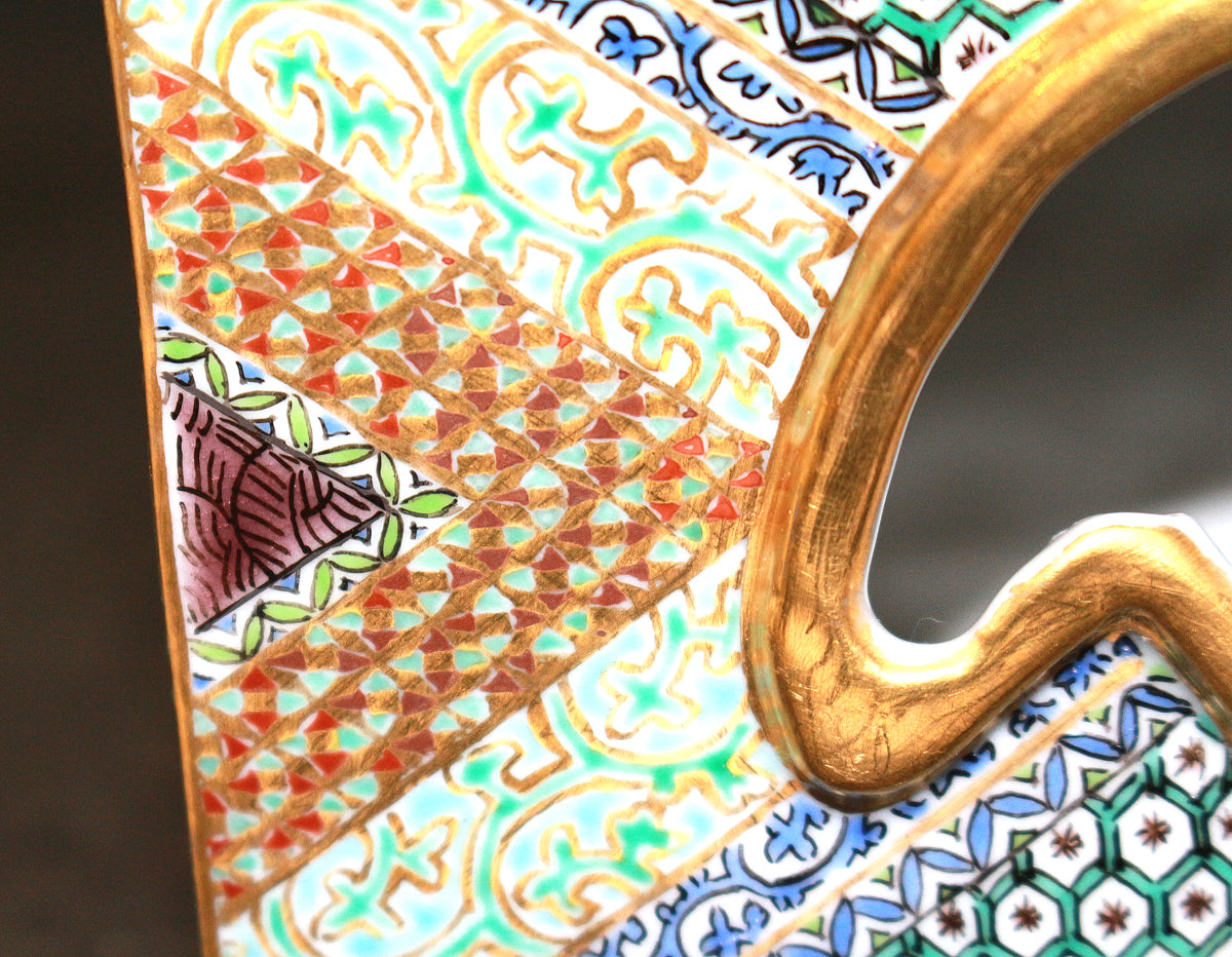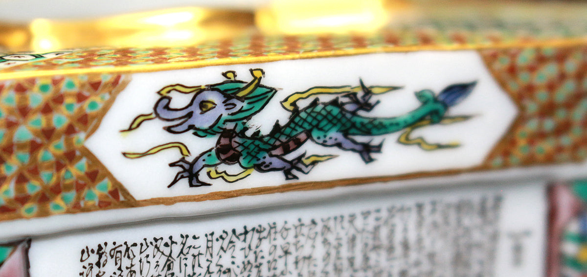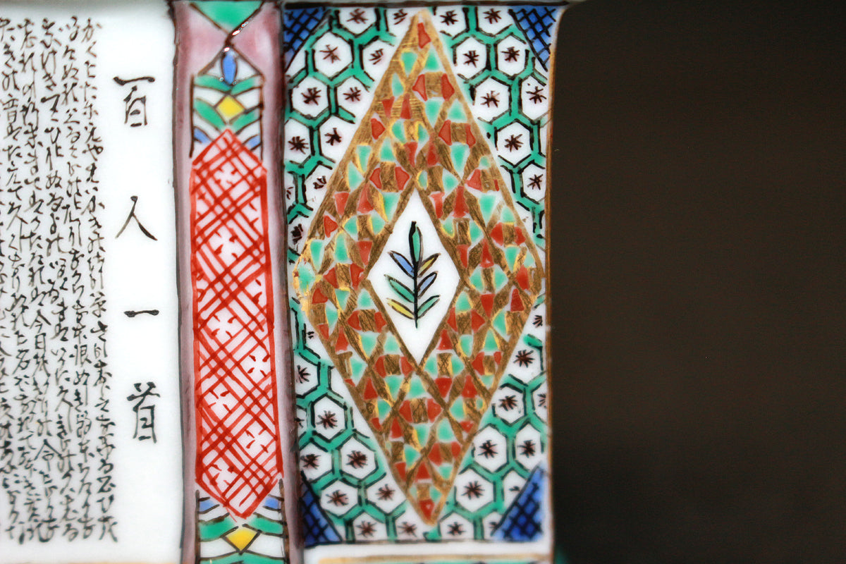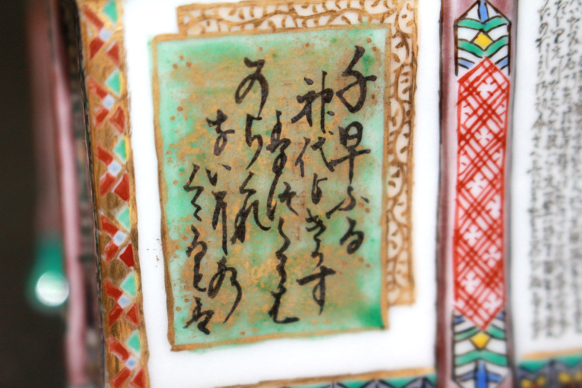 「九谷毛筆細字(さいじ)技法」とは、主に和歌などの古典文学を極細の毛筆で磁器に描き込む技法です。明治以降、九谷焼の繊細な絵付けに見合う表現として石川県の南部地方で独自に発展してきました。現在まで一世紀以上に亘り、田村家に一子相伝の技法として受け継がれています。