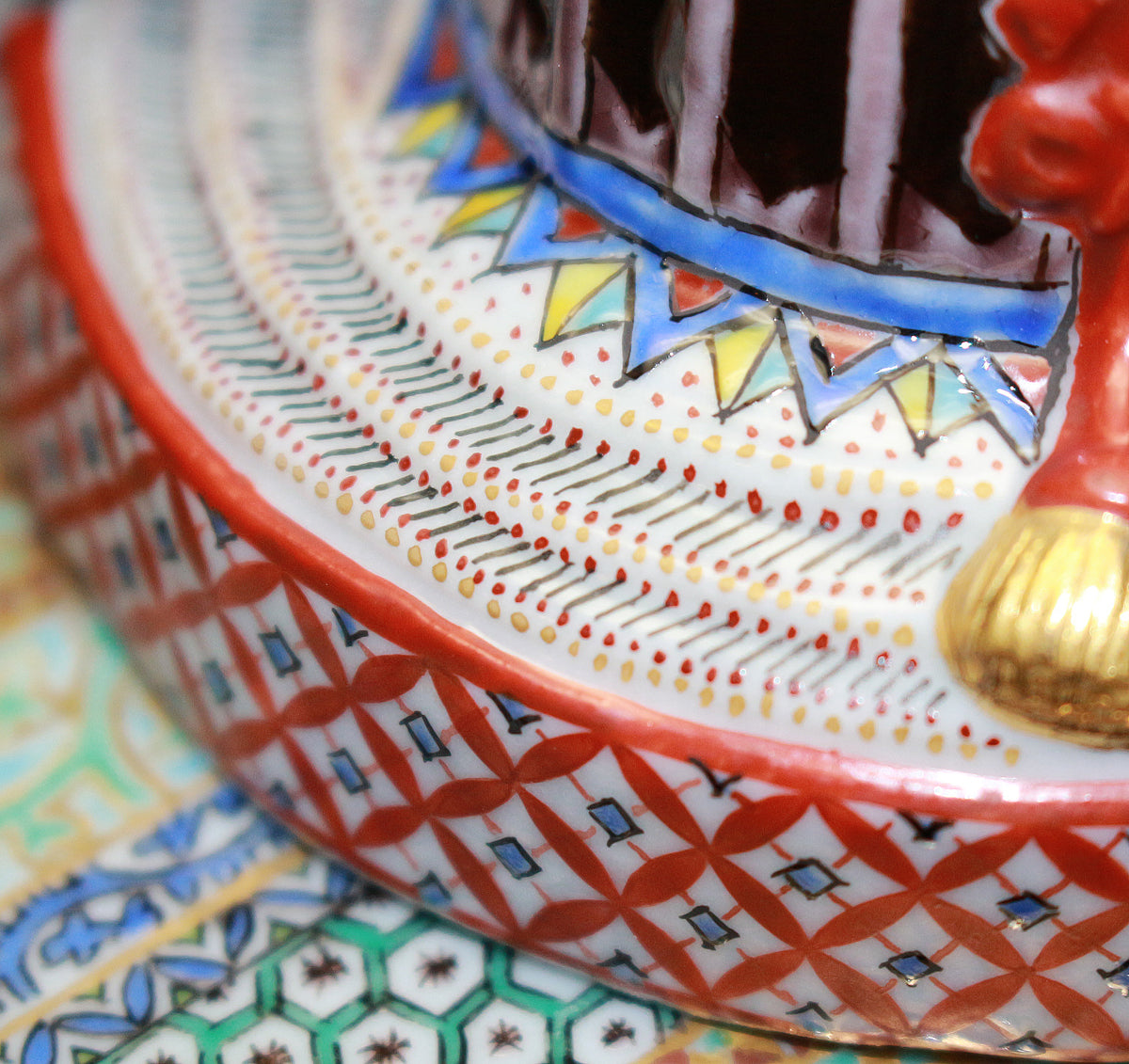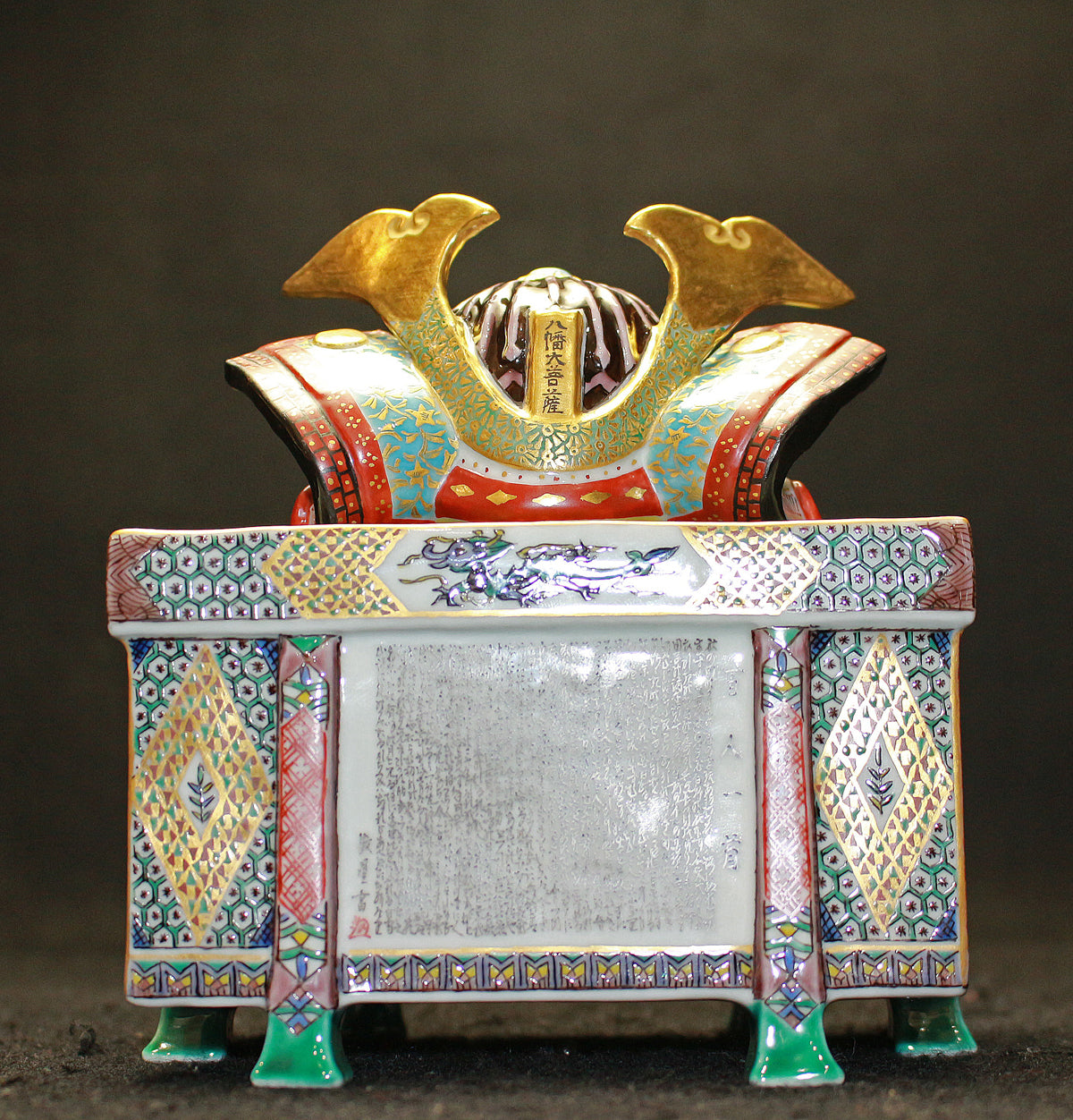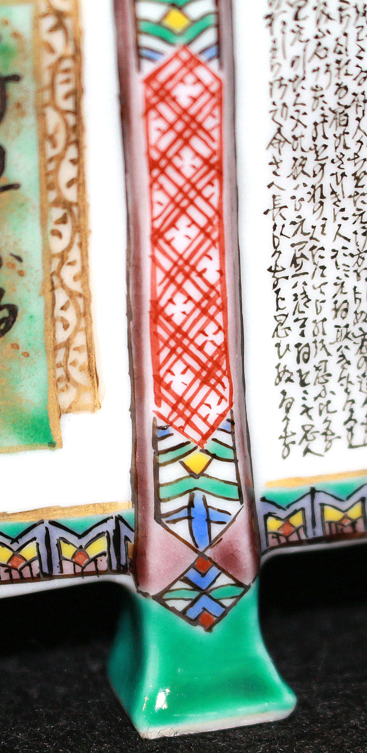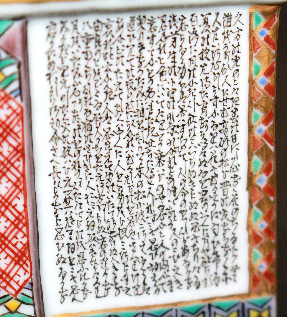 細字はマンガンを原料とした釉薬で描かれた後、約800度で焼成されます。粘性のある釉薬を用いて極小の文字を描くことは難しく、技術の修得には長い年月を要します。 立体で曲面の多い素磁に整然と文字を配列し、絵付け全体とのバランスを図る為に、作業は基本的には裸眼で行います。また、器の内側に描く際は、縦の線は下から上に引くなど通常とは全く異なる書き順を用います。極小でありがながらも書としての美を兼ね備えた文字表現を目指して、独自のさまざまな工夫が凝らされています。 まさに技法の粋を極めた象徴的な作品であり、歴代が技術の研鑽の為に取り組んできました。