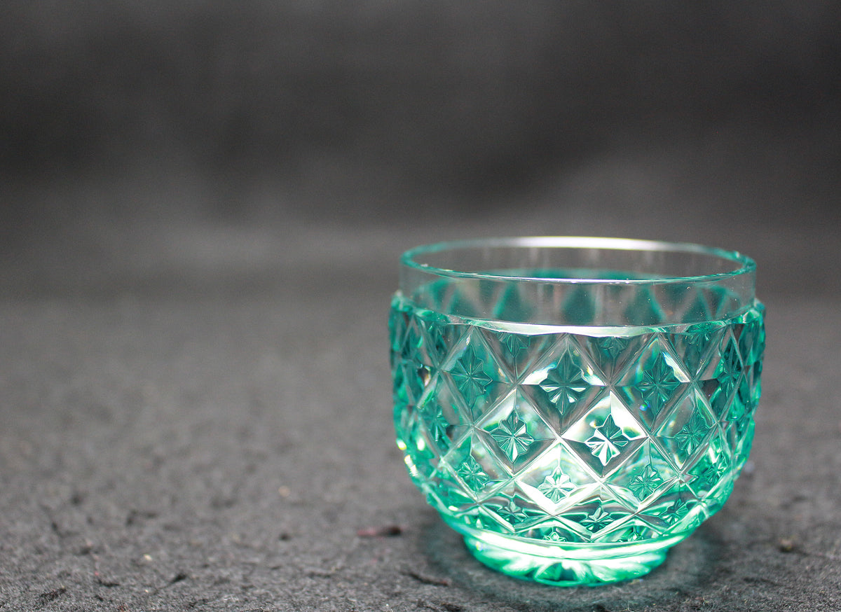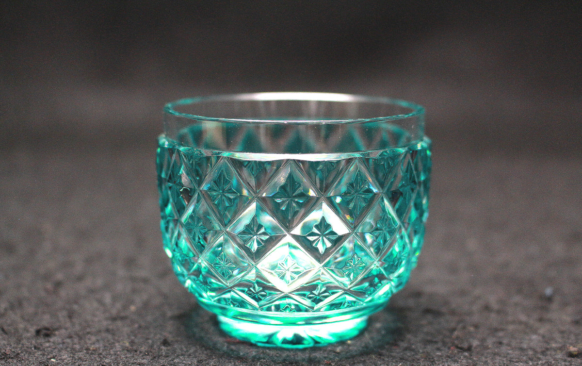 薩摩びーどろ工芸の復元薩摩切子には、金赤や緑などの様々な色の猪口があります。八角籠目紋様など、江戸切子でも好まれる伝統的な紋様が用いられています。手作りのため、サイズや容量、フォルムに多少の違いがあることもあります。