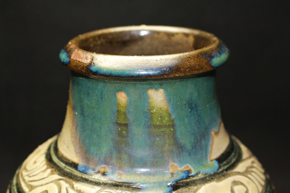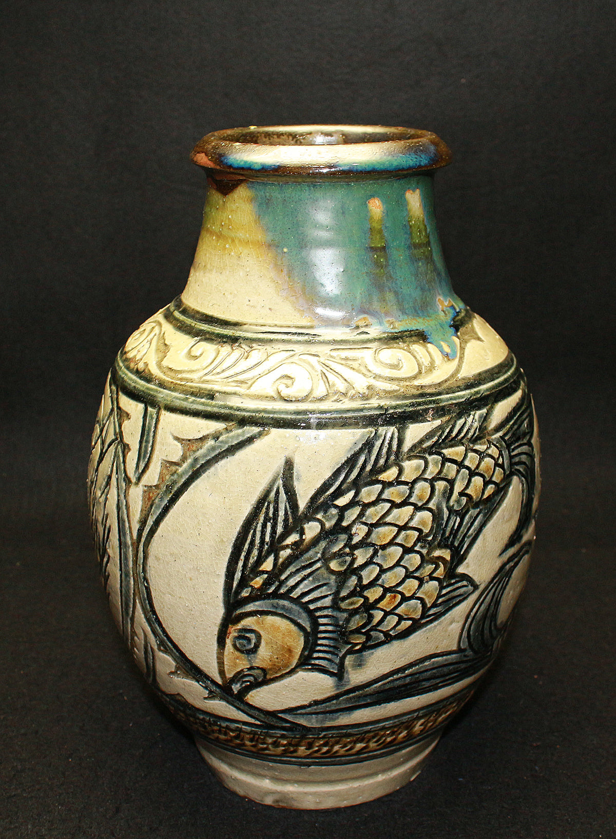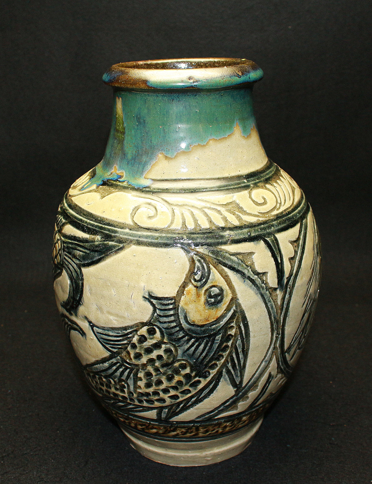 金城次郎の魚紋花瓶は、そのどっしりとした厚みのある佇まいと、力強く彫られた魚の模様が特徴です。