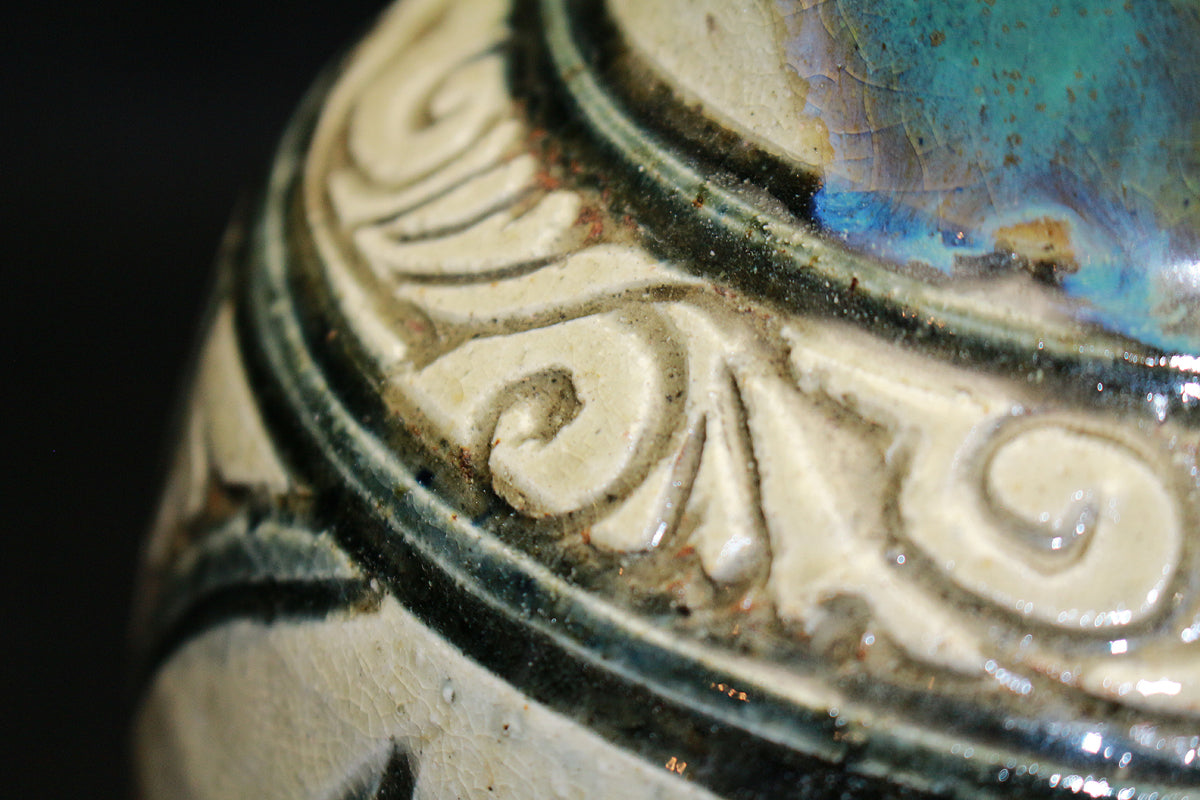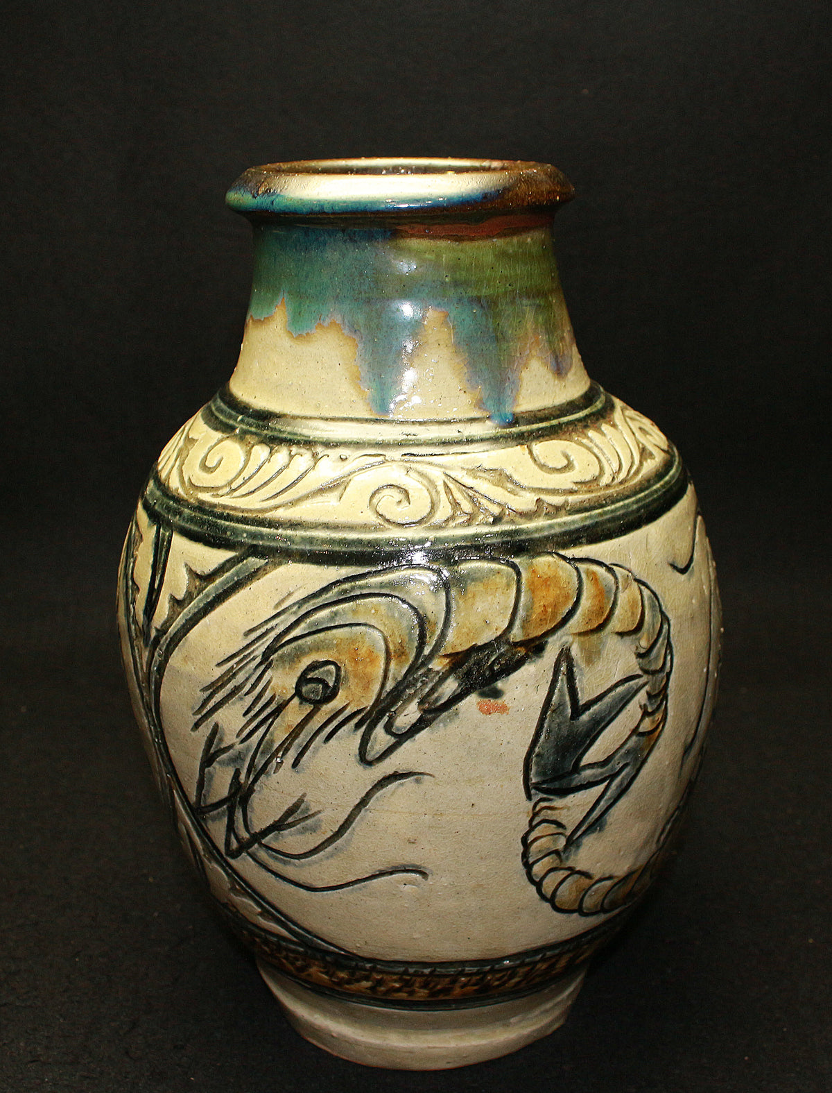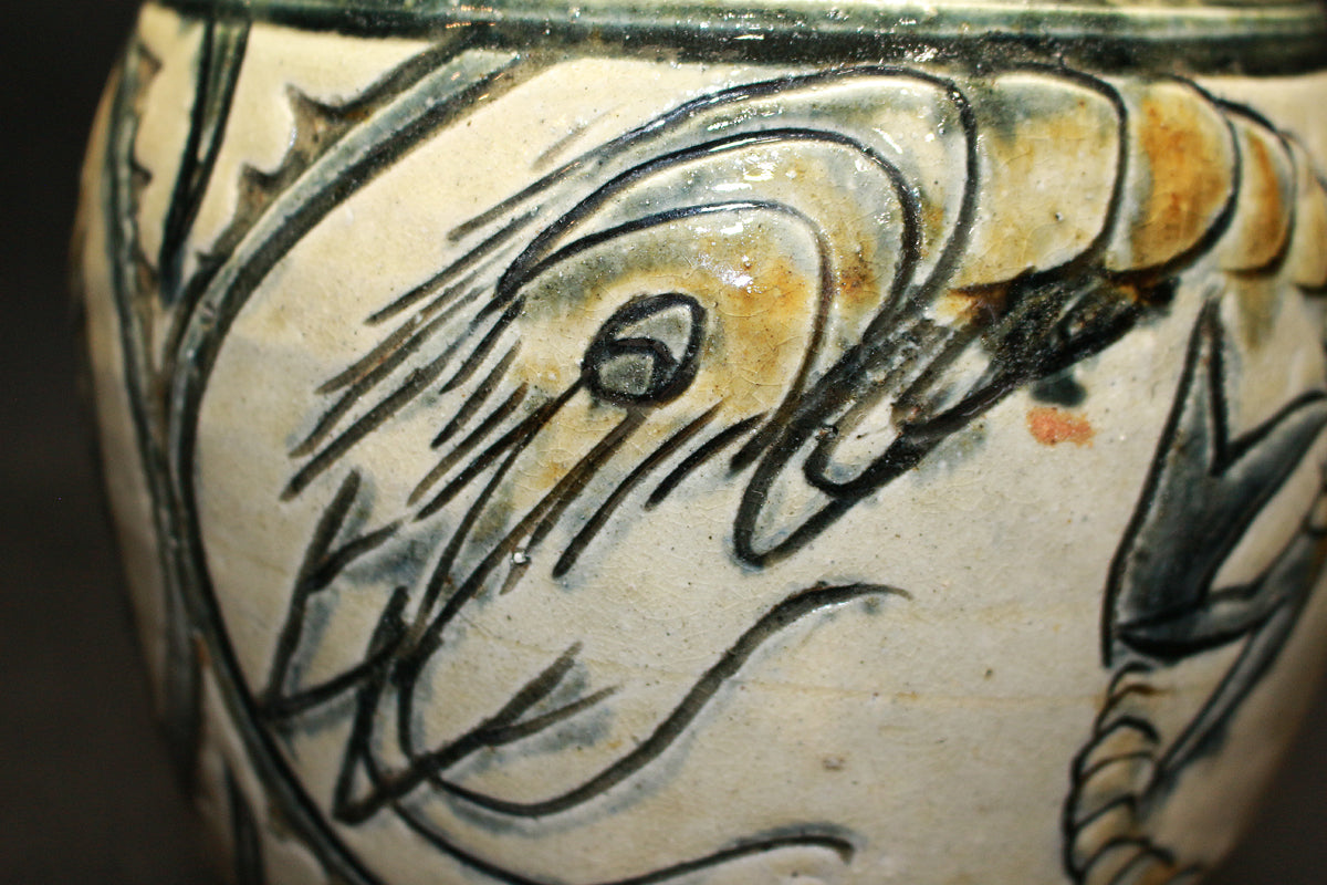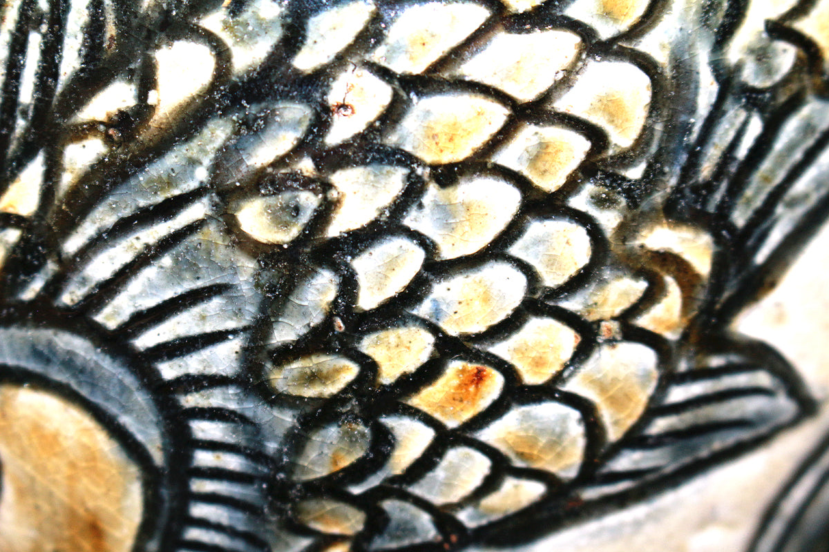 特に「笑う魚」など、ユーモラスな表情の魚紋は金城作品の象徴的な絵柄とされており、作品に温かみを与えています。彼は、沖縄の伝統である琉球陶器の再現を目指し、浮彫り技法を用いて抽象化された魚や海老の意匠を取り入れ、独自の温かい陶芸を生み出しました。