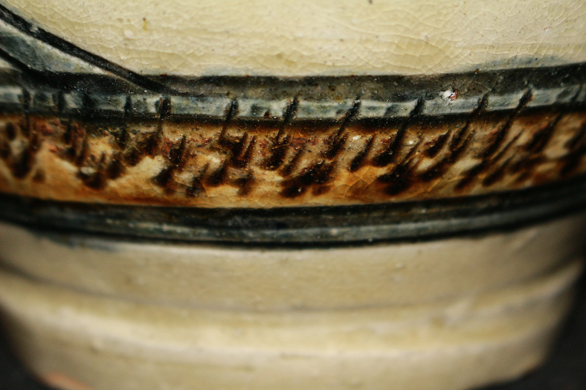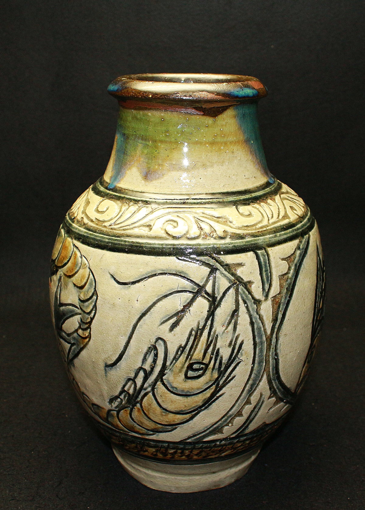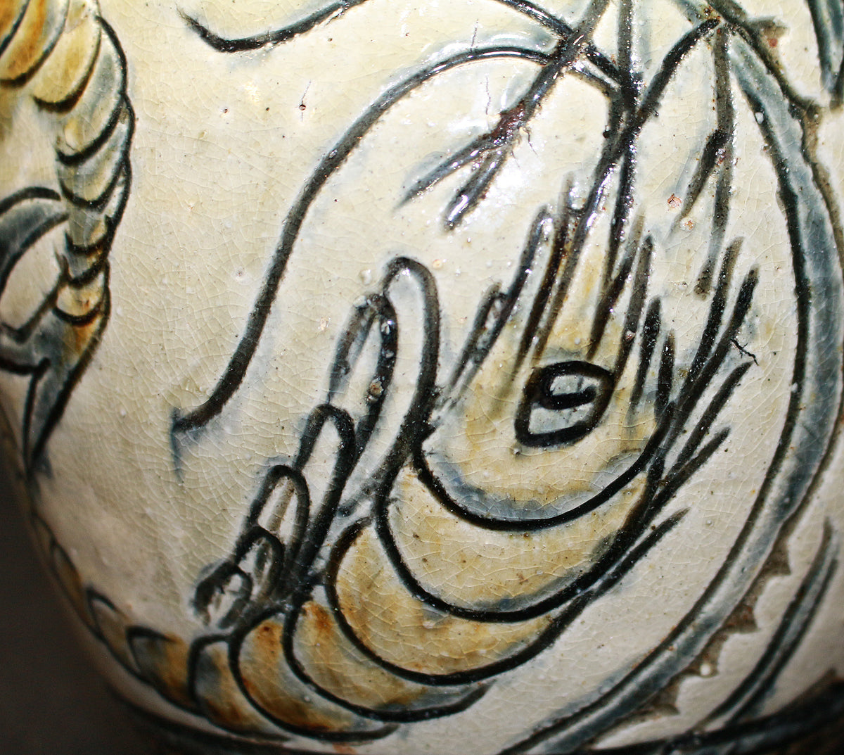 特に「笑う魚」など、ユーモラスな表情の魚紋は金城作品の象徴的な絵柄とされており、作品に温かみを与えています。彼は、沖縄の伝統である琉球陶器の再現を目指し、浮彫り技法を用いて抽象化された魚や海老の意匠を取り入れ、独自の温かい陶芸を生み出しました。