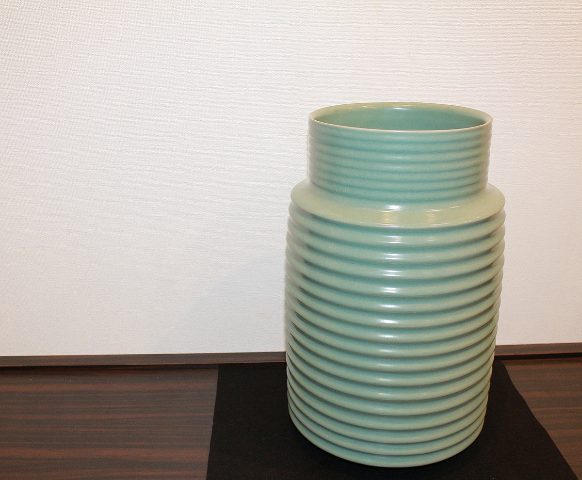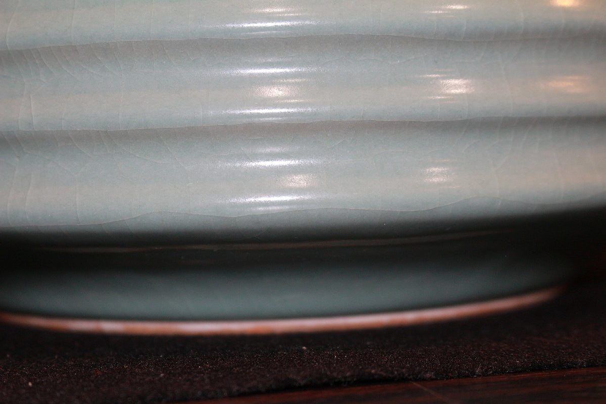 地元の弓野古窯跡に築窯し 「日本陶芸協会賞」などで受賞をかさね 「中島青磁」とも呼ばれるその独創的な作品が高く評価され人間国宝に認定された中島宏。中国陶磁器を範としながらも 単なる写しに終わっていない この重厚感――― 探究の先にある作者独自の境地から生まれた「中島青磁」の本作は 中国陶に迫る現代陶磁器の至宝中の至宝。