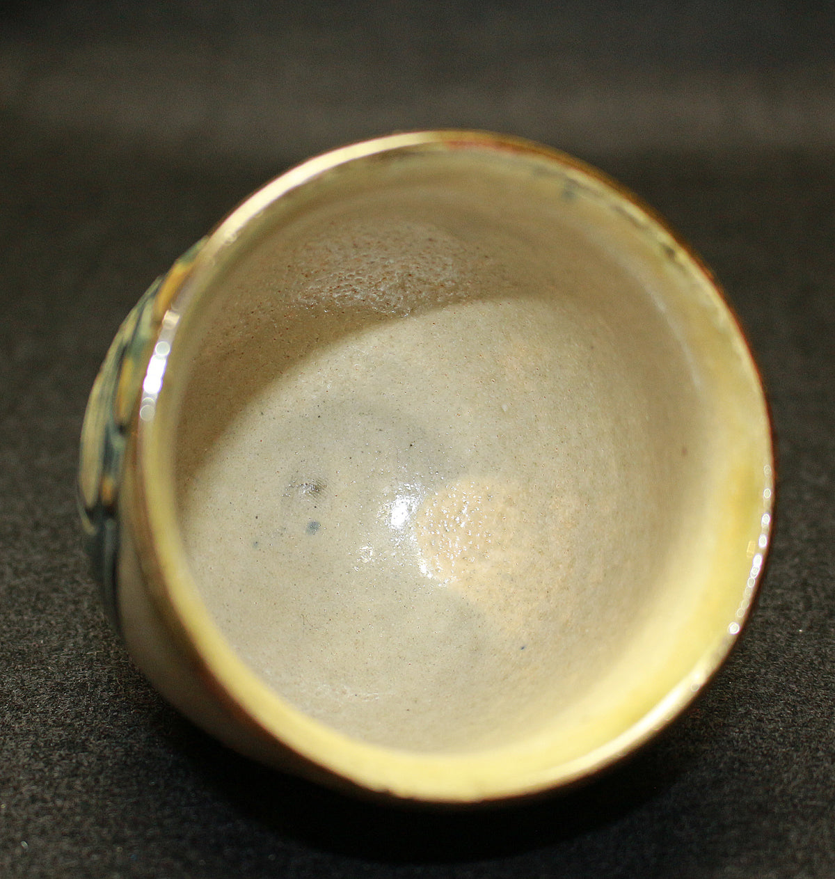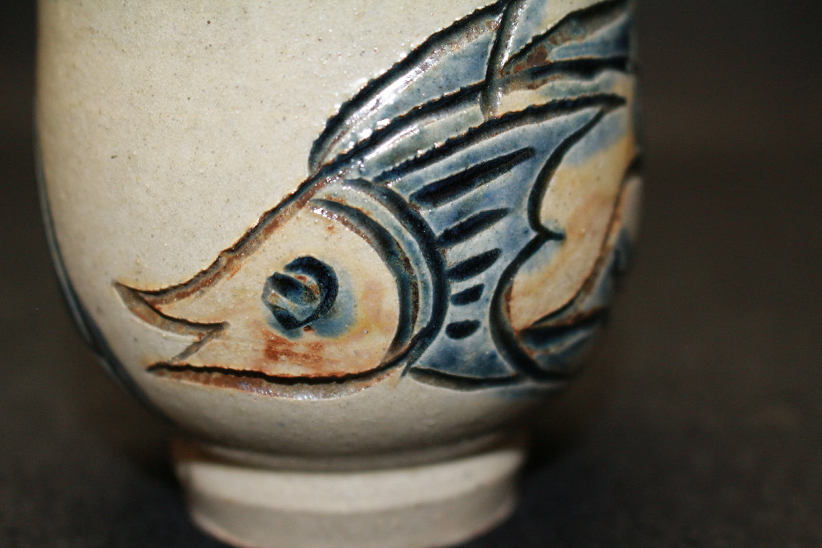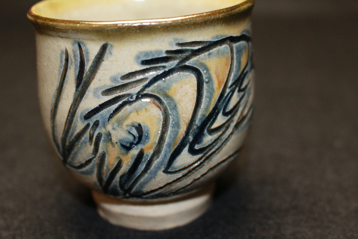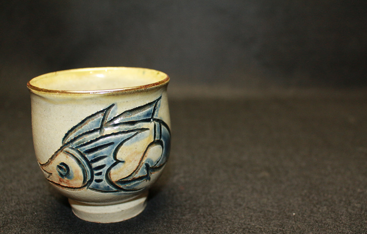 那覇市生まれの陶芸家。国の重要無形文化財「琉球陶器」技能保持者(沖縄県で初の人間国宝)。 得意の魚と海老が、描かれているです湯呑です。