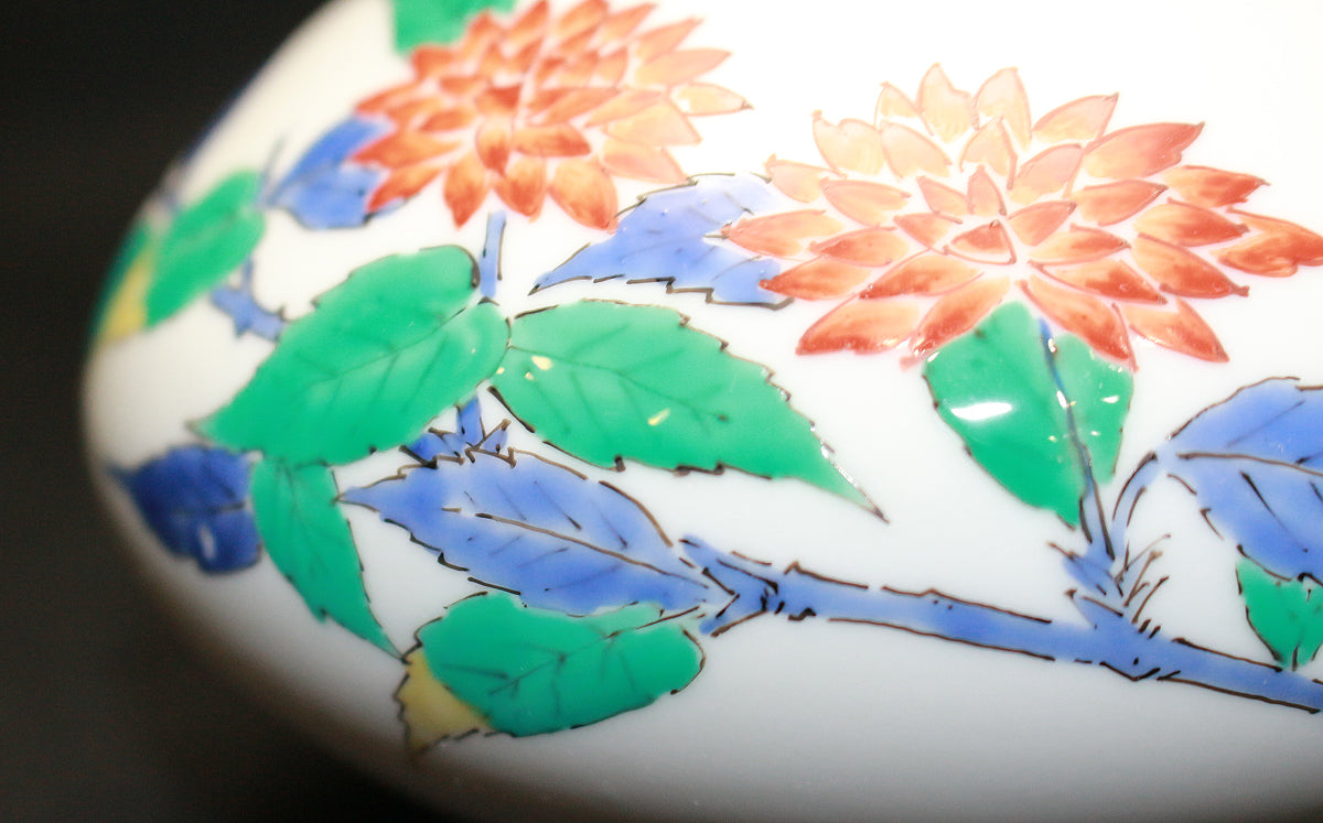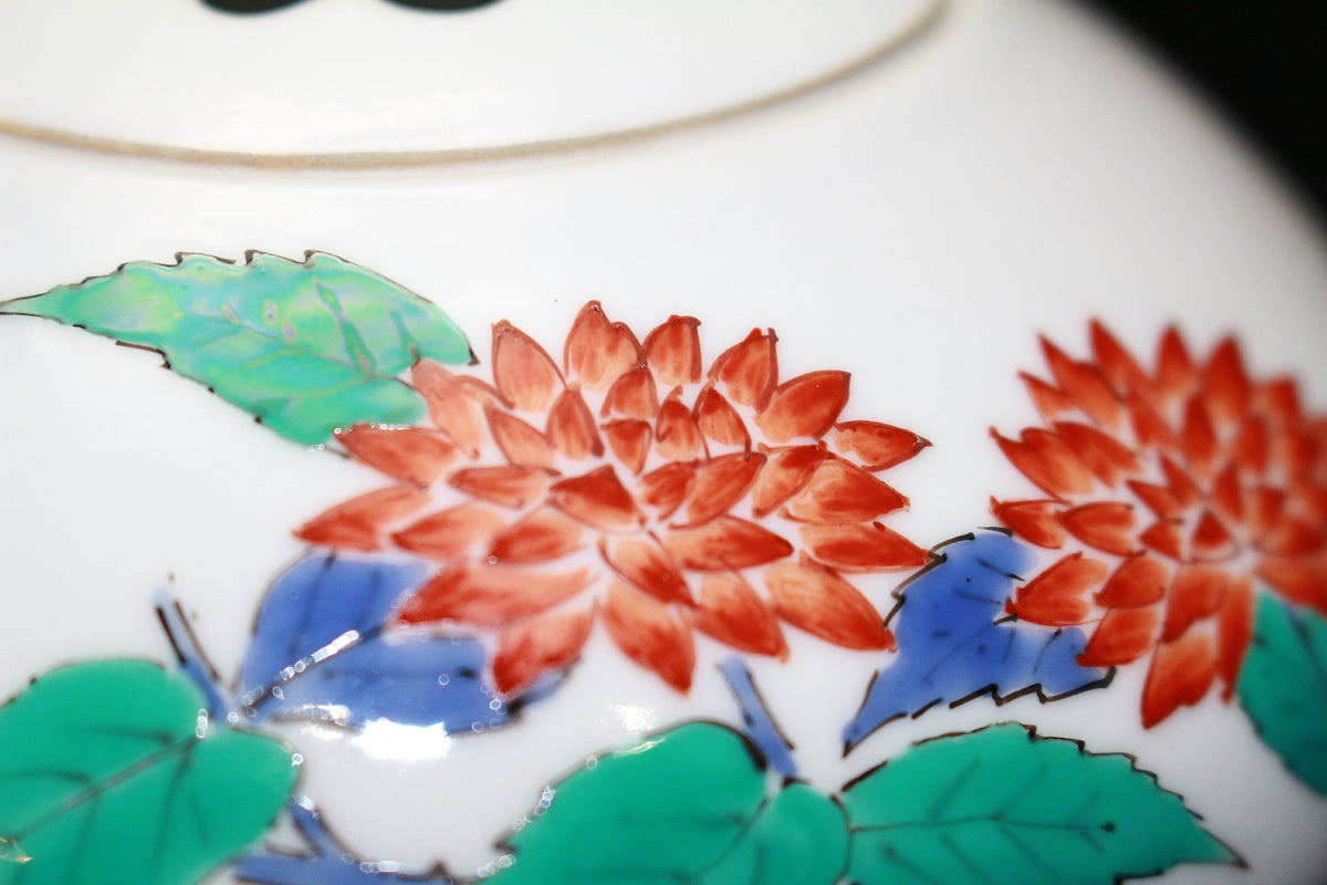 一時は衰退していた「濁手」を12代である父とともに復元し、歴代柿右衛門随一の腕前を誇り、現代柿右衛門隆盛の基盤を築いた偉大な陶芸家【13代酒井田柿右衛門】(1906-1982)本人作。 非常に秀逸な作域と品格に満ちた作品です。濁手ならではのしっとりとした乳白色の美しい素地が魅力であり、13代の独創性が大いに発揮された図案は見る者の心を引寄せます。 伝統的素地と図案が調和して現代を彩る。。。まさに13代の信念が表現された極めて素晴らしい上品な一作です。