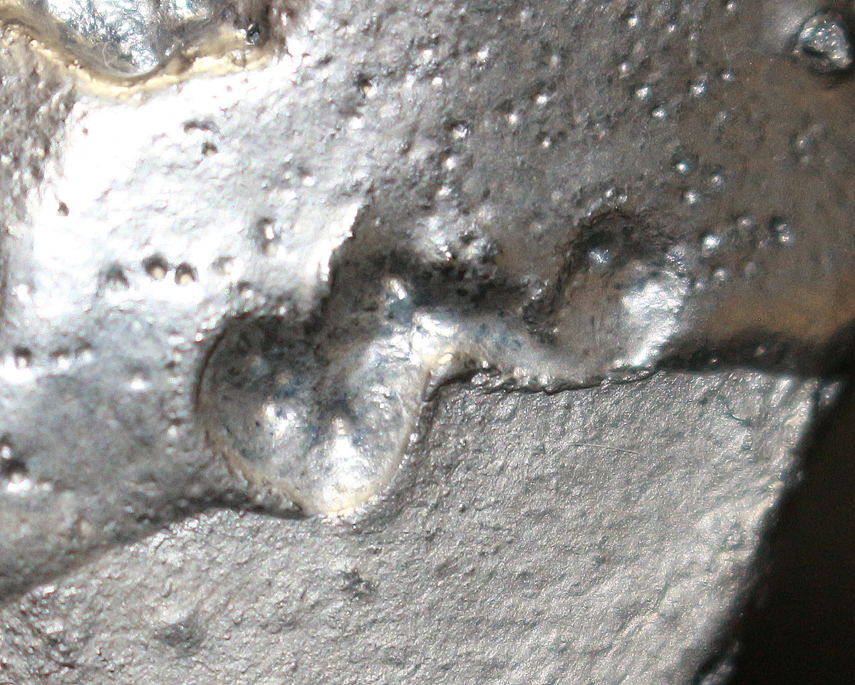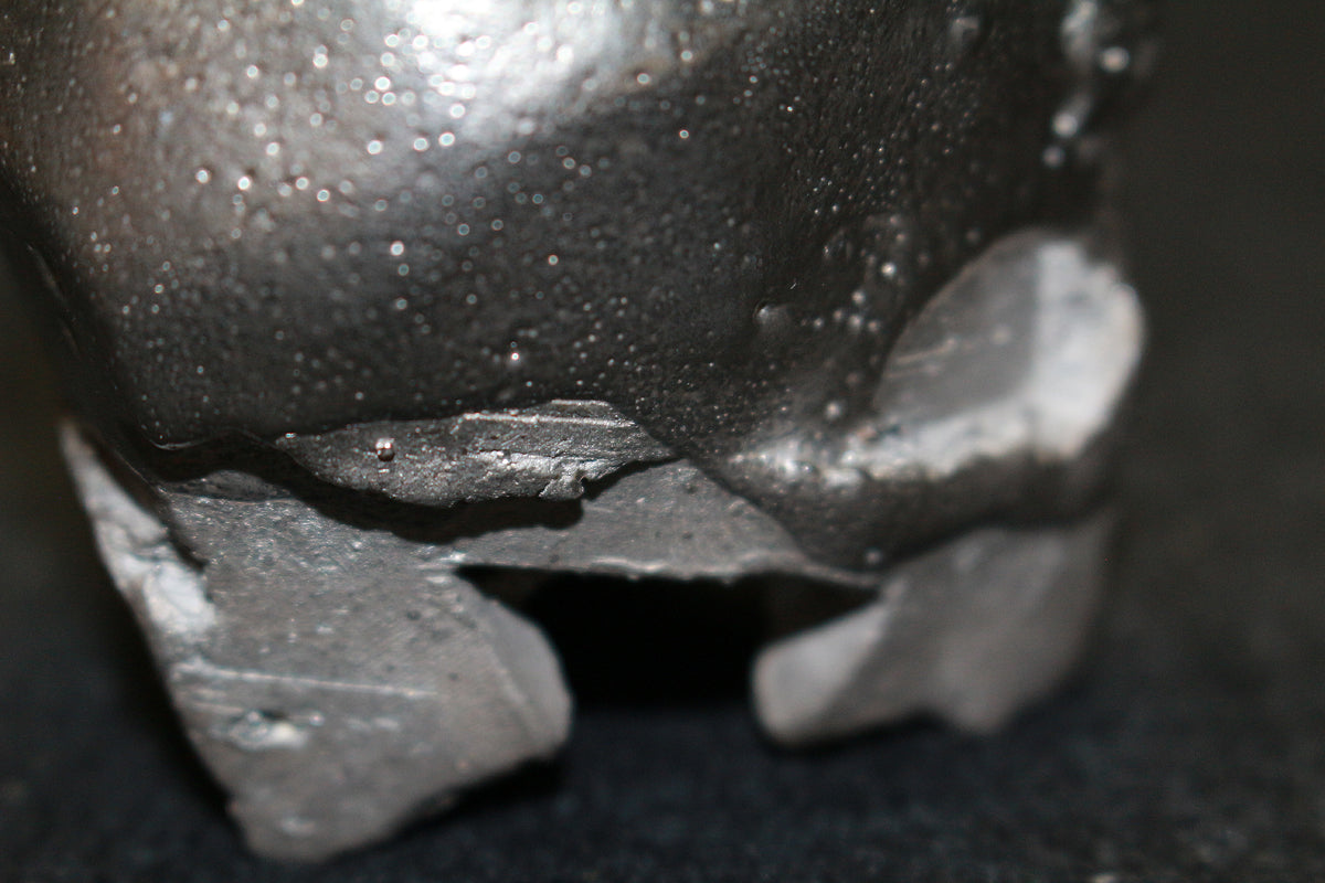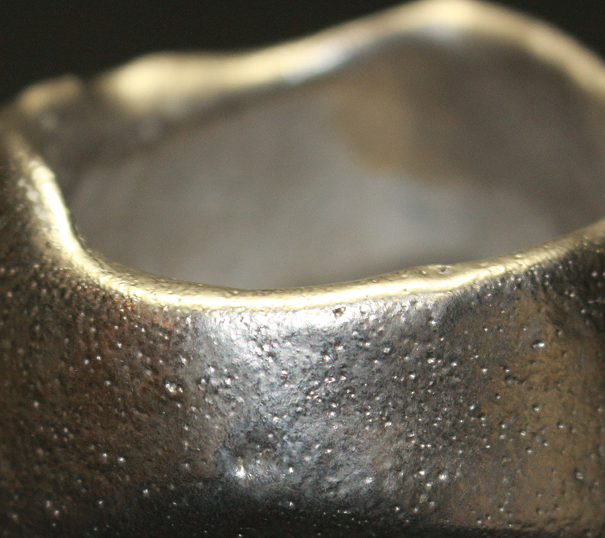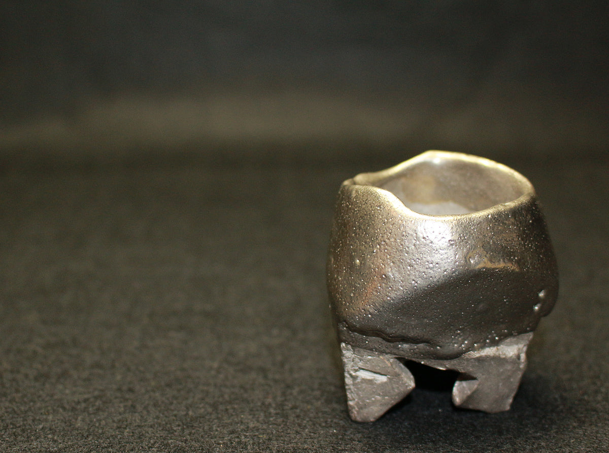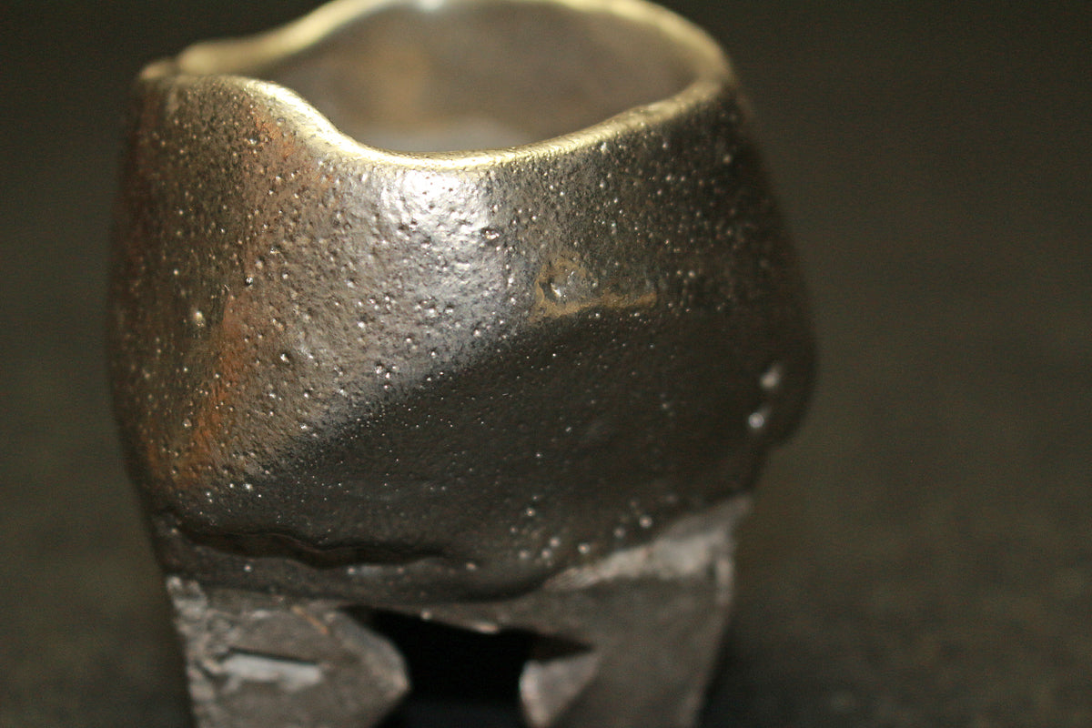 備前焼界のみならず世界に名高い異色の備前焼作家 隠崎隆一先生の銀彩酒呑です。 シルエット自体はシンプルであり、焼き上がりは素朴な備前焼のイメージを覆し、備前土で多様な表現を生み出しています。