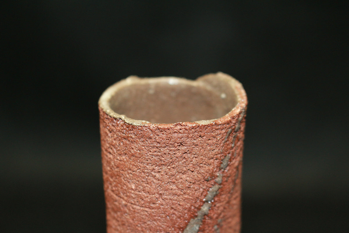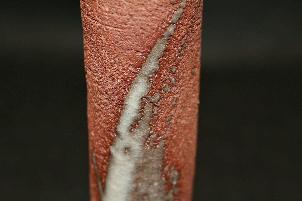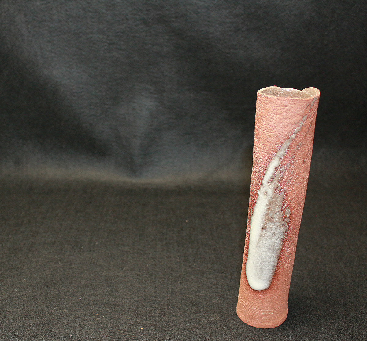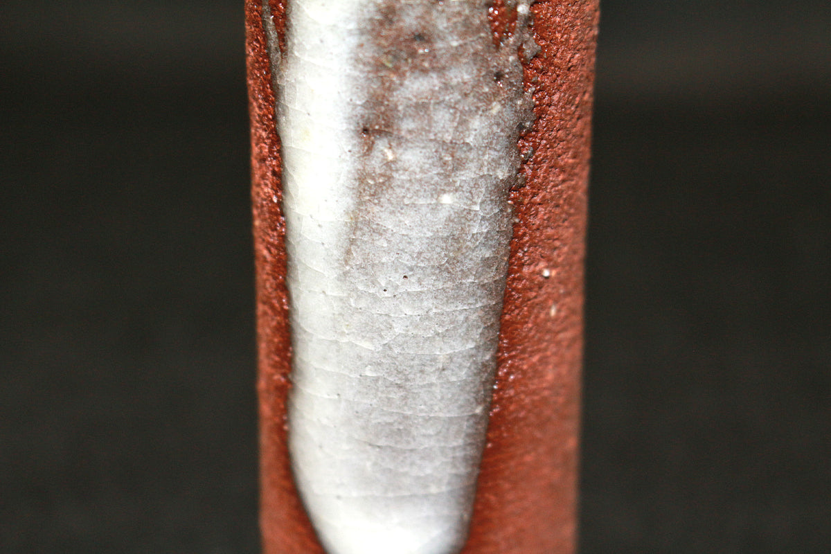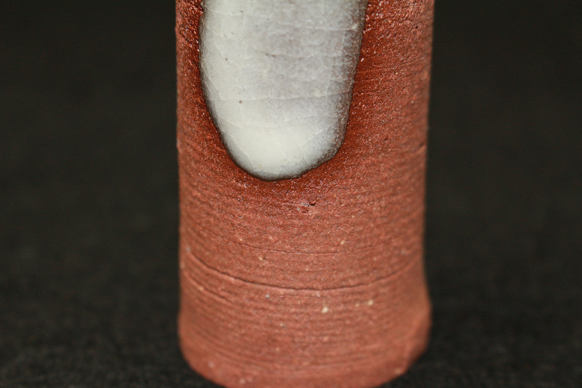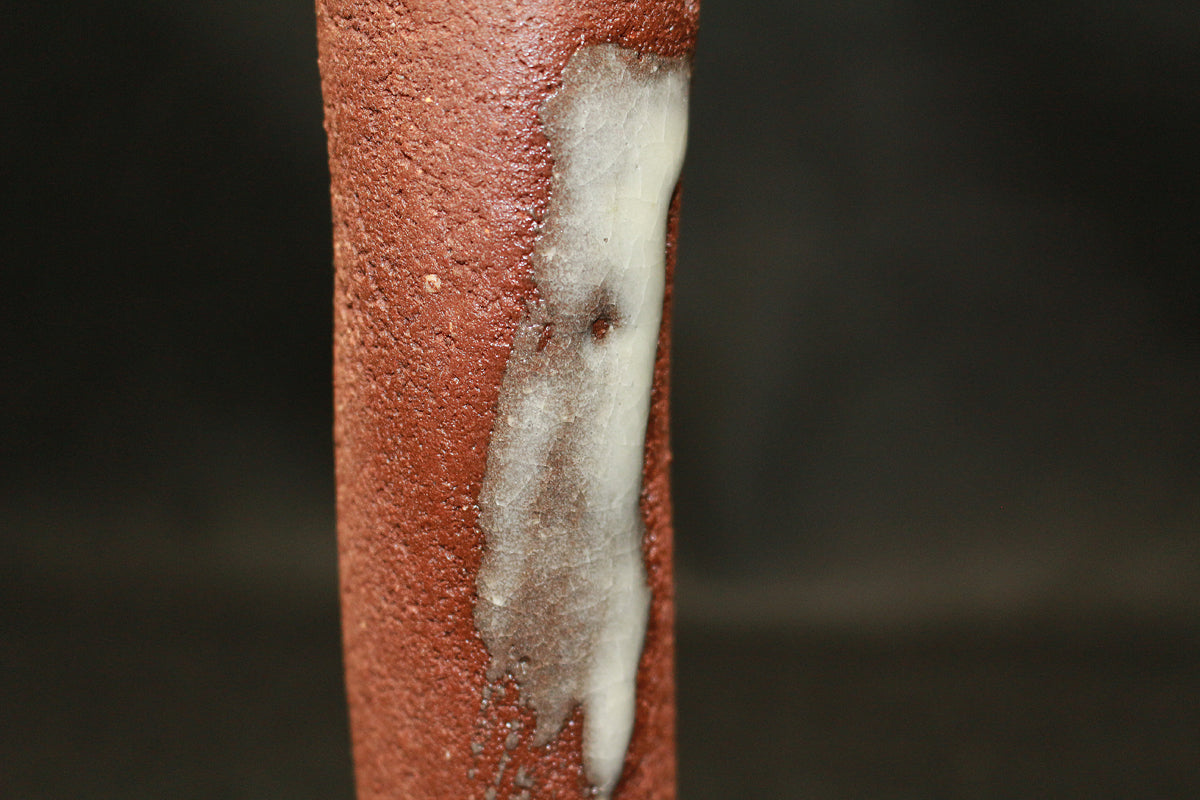 走泥社の中心者として脚光を浴びられたその創造性豊かな意匠は他には表現しきれないものがあり、そのシンプルな姿により一層その個性も映し表されており、その緋色の土に掛けられた白釉の映り、コントラストも瀟洒であり現在においてもなおその新鮮さを伝えてくれます。