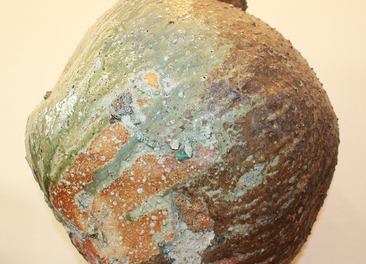 これは、薪を燃料とする焼成中に灰が作品に降りかかり、高温で溶けてガラス質に変化することで生まれるものです。自然の偶然によって生まれるため、同じ色の作品は一つとしてありません。