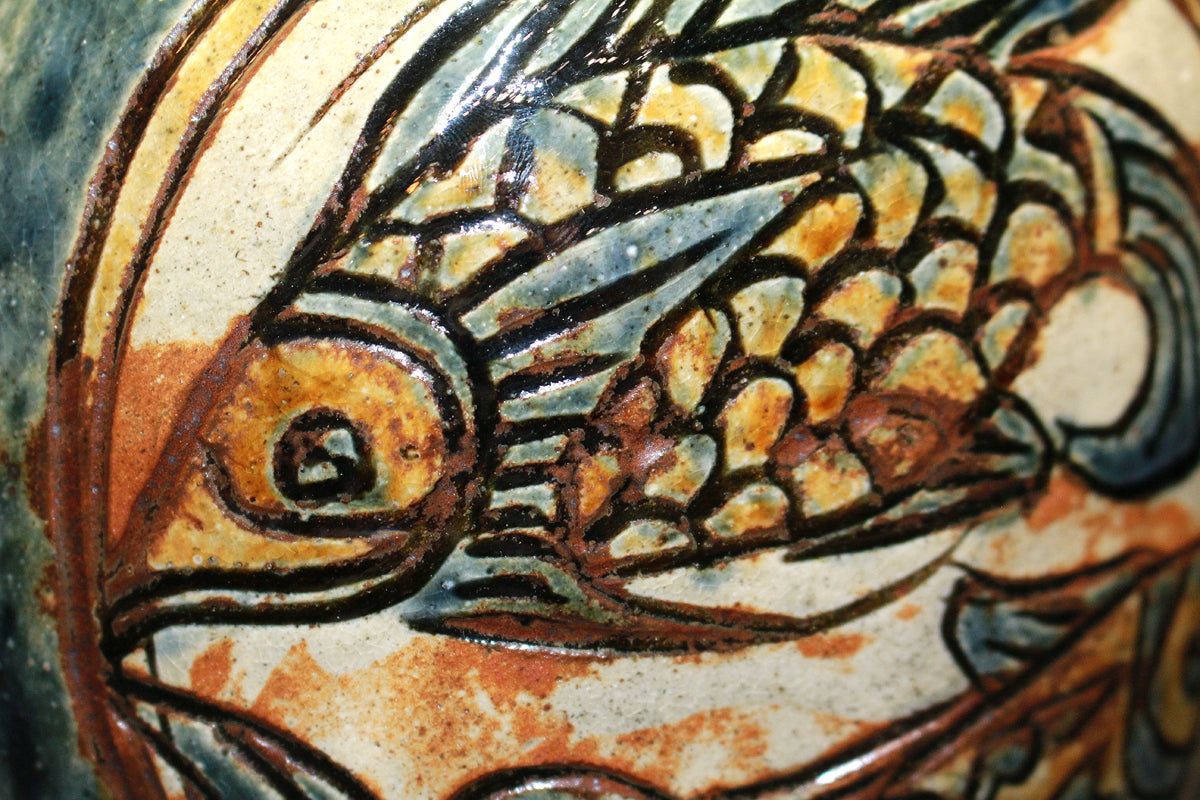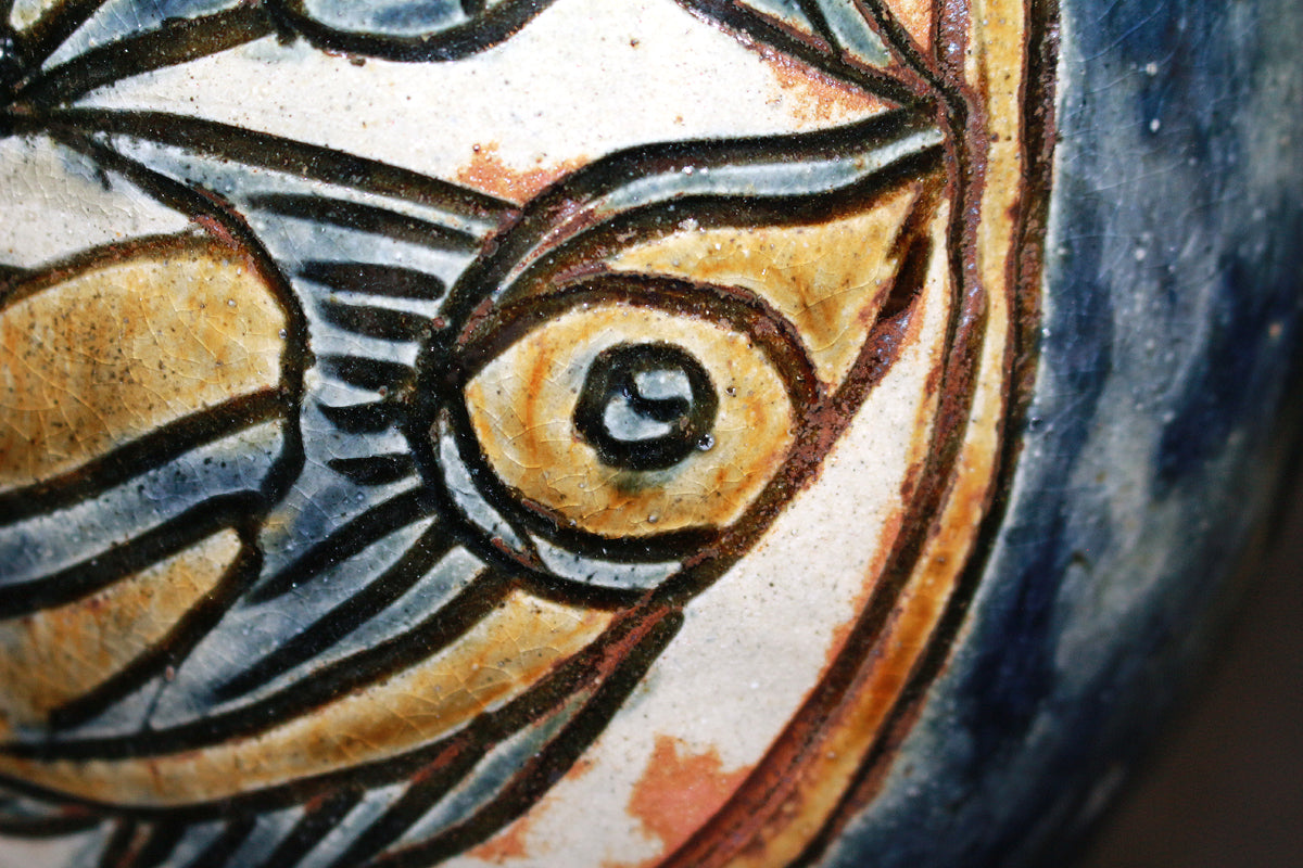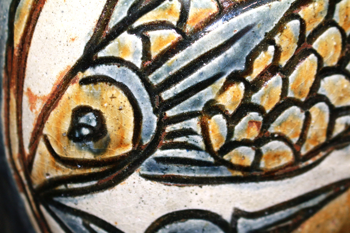 特に「笑う魚」など、ユーモラスな表情の魚紋は金城作品の象徴的な絵柄とされており、作品に温かみを与えています。彼は、沖縄の伝統である琉球陶器の再現を目指し、浮彫り技法を用いて抽象化された魚や海老の意匠を取り入れ、独自の温かい陶芸を生み出しました。