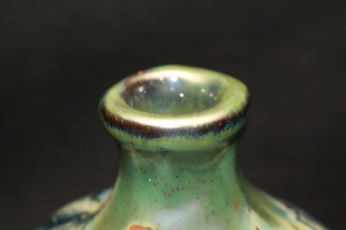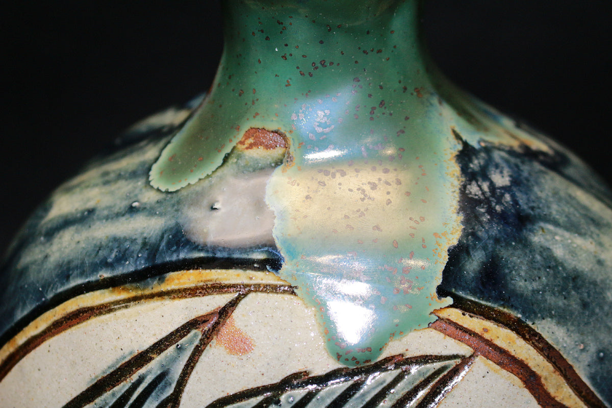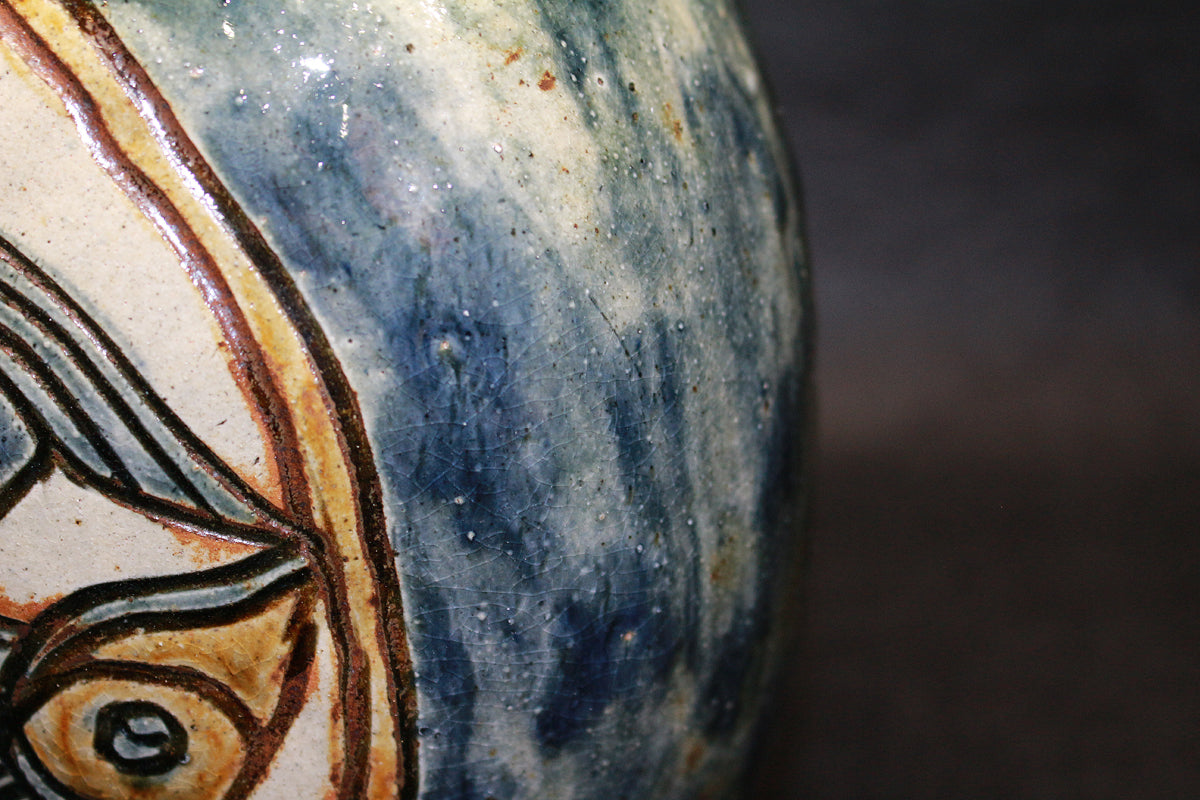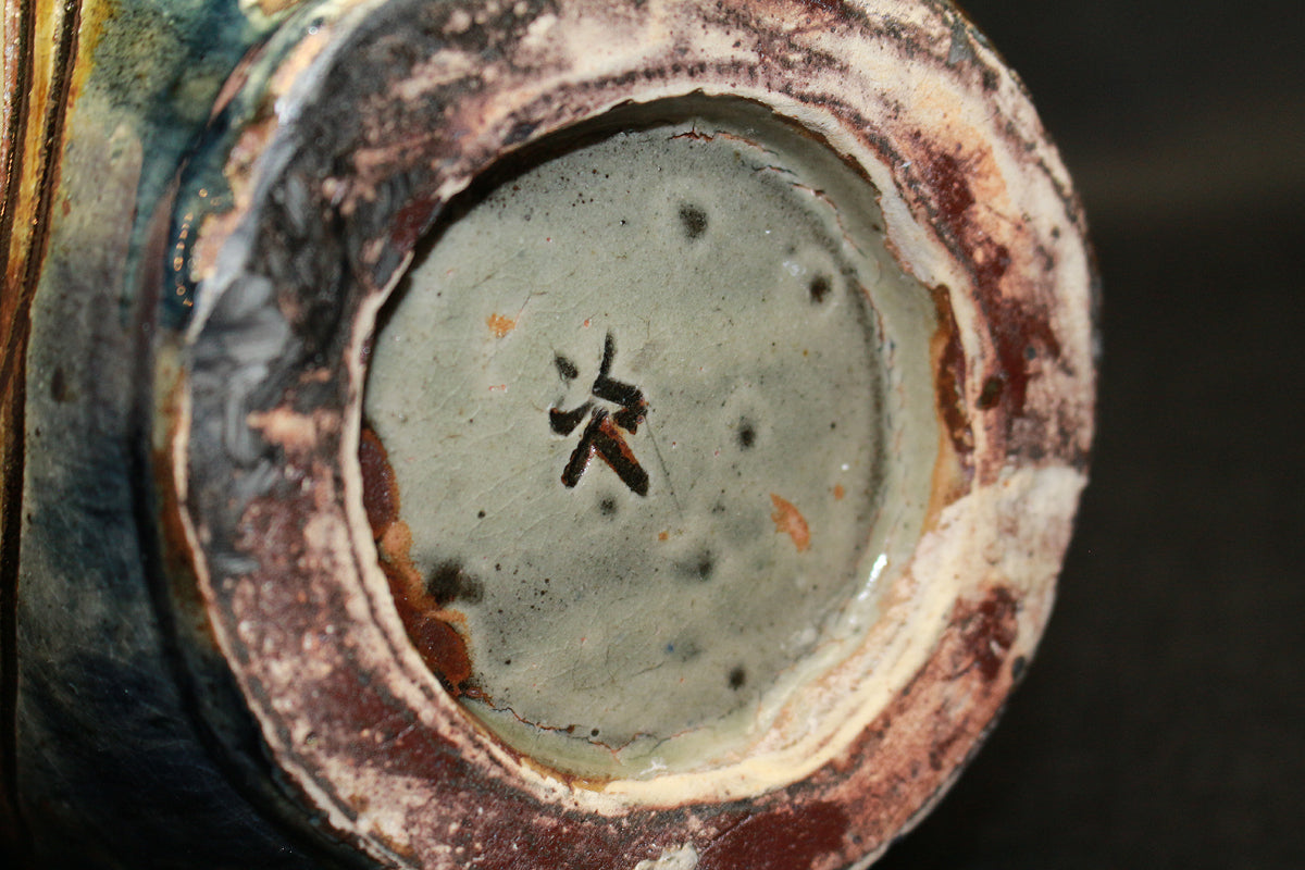特に「笑う魚」など、ユーモラスな表情の魚紋は金城作品の象徴的な絵柄とされており、作品に温かみを与えています。彼は、沖縄の伝統である琉球陶器の再現を目指し、浮彫り技法を用いて抽象化された魚や海老の意匠を取り入れ、独自の温かい陶芸を生み出しました。