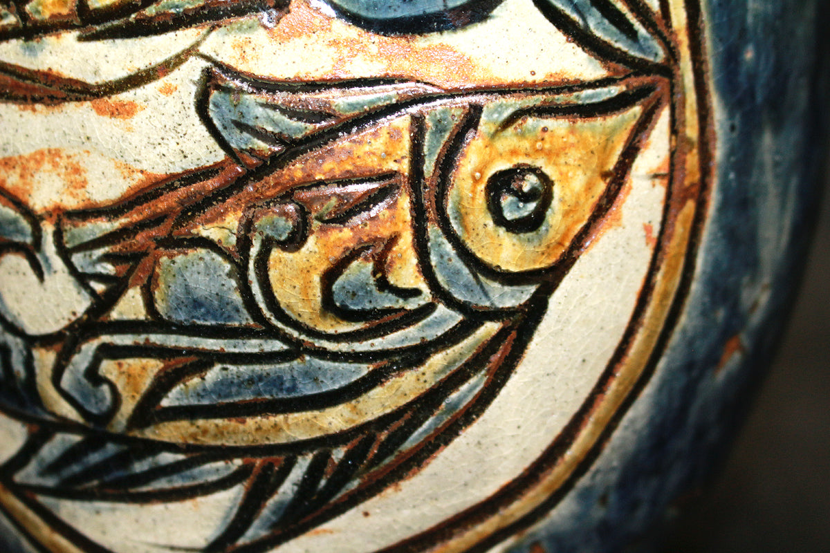 金城次郎の作品に登場する「魚紋」は、魚がたくさんの卵を産むことから子孫繁栄を意味する縁起の良い文様として親しまれています。