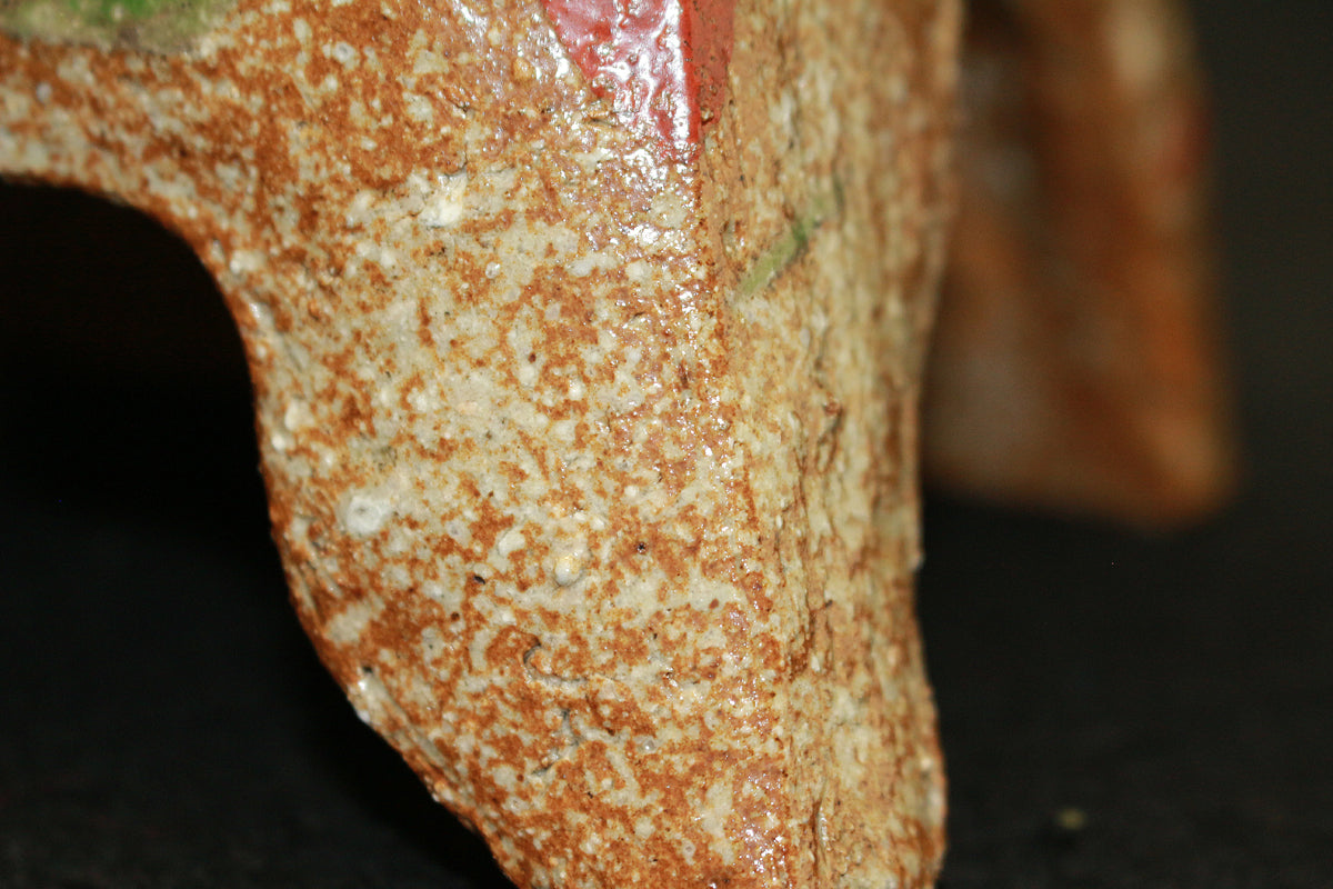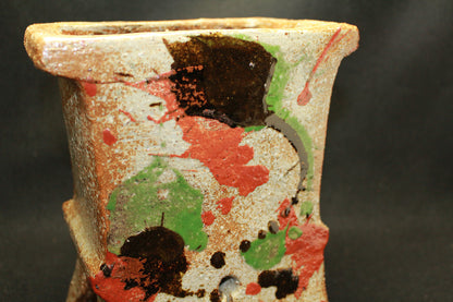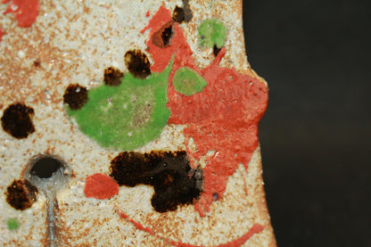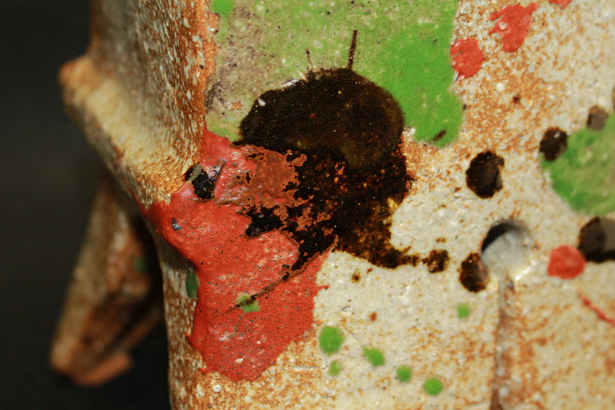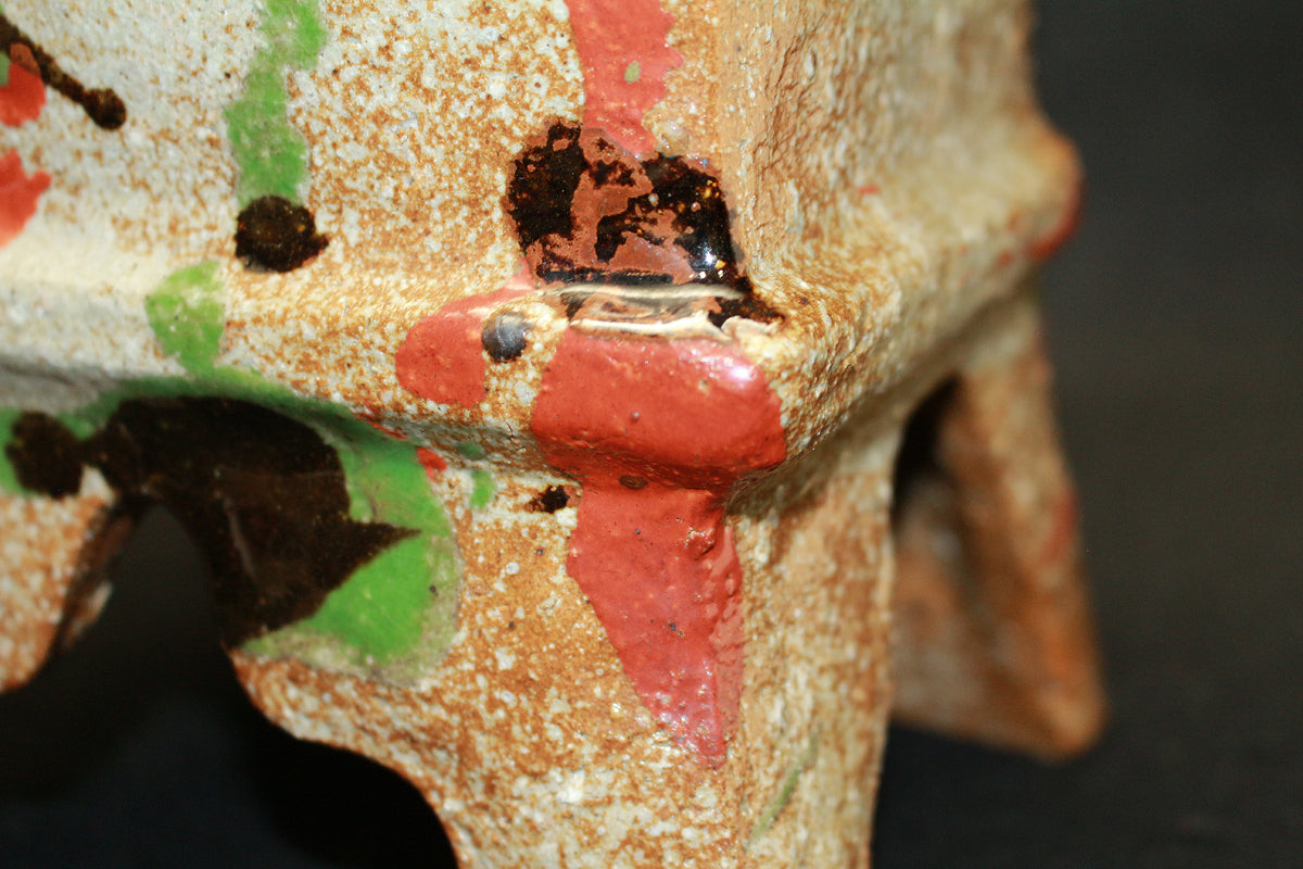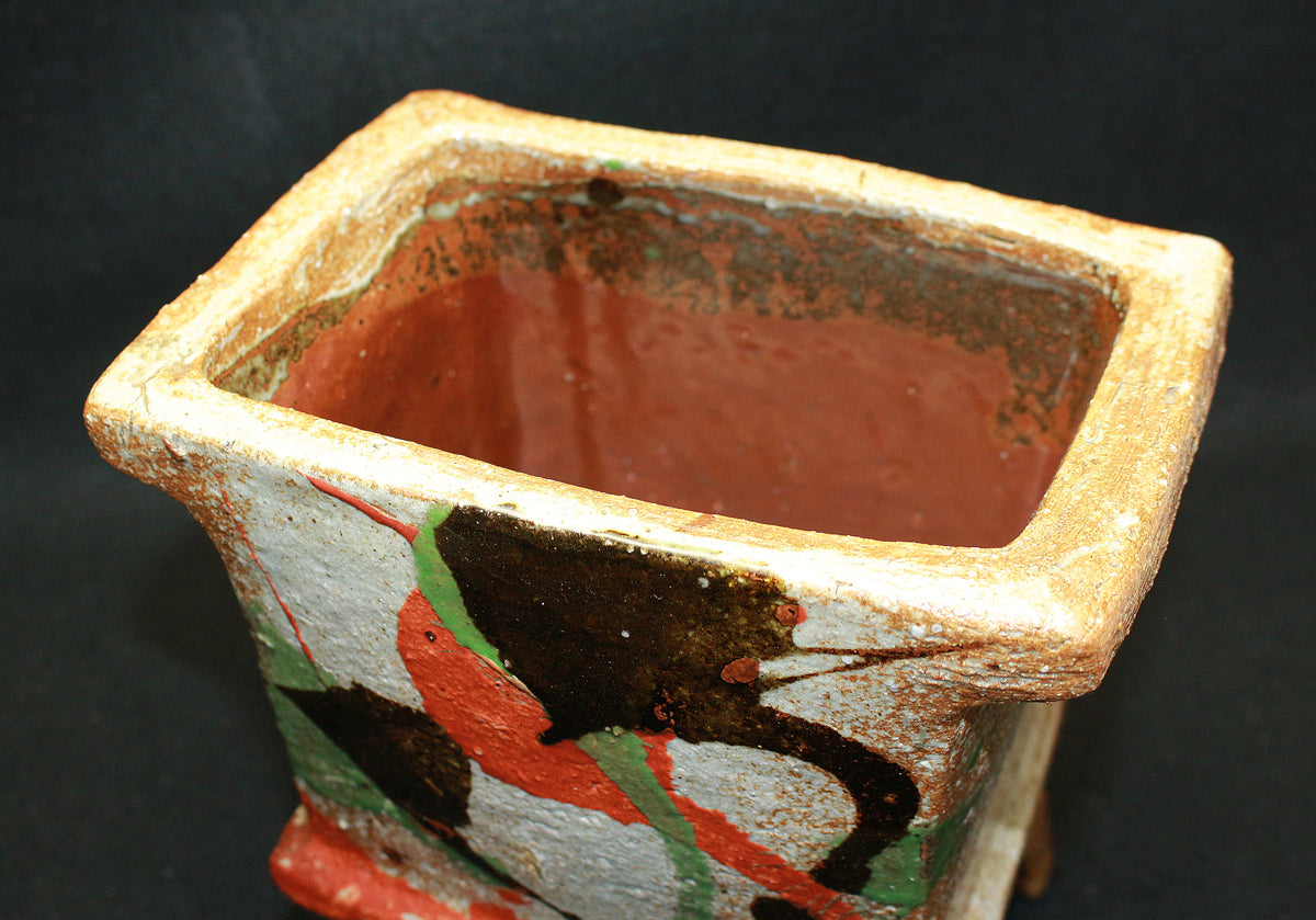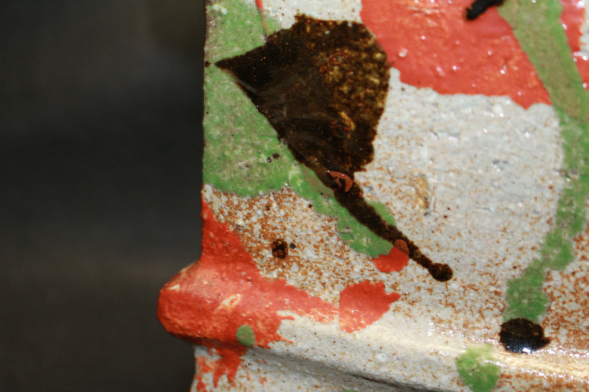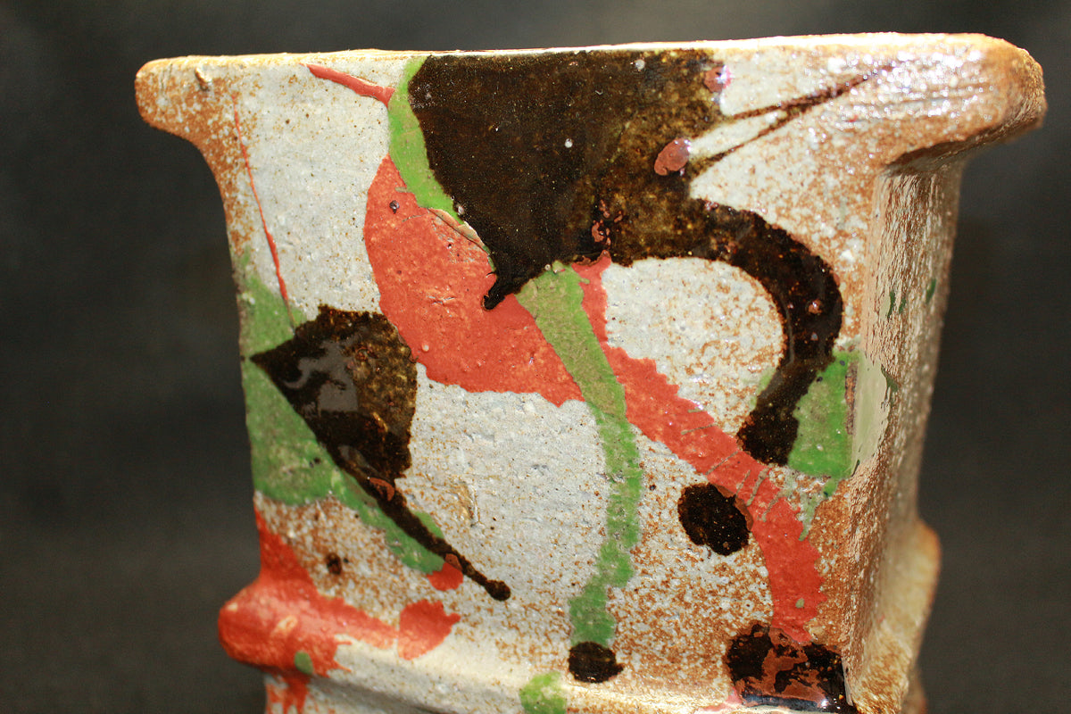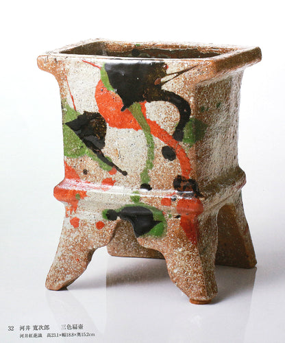日本民藝界を代表する柳宗悦、浜田庄司、また日本近代工芸を代表する富本憲吉、黒田辰秋など現在までその名が語り継がれる巨匠らと共に日本民藝界の礎を築きその中心人物として活躍。 「用の美」を追求した重厚かつ素朴な作風で近代陶芸の新境地を開拓しミラノ国際展大賞受賞など世界的にも評価の高い日本民芸界を代表する巨匠 河井寛次郎。 本作は寛次郎による抜群の造形美と目が覚めるような発色を持つ赤・黒・緑の三色を打つ掛けた名品である。