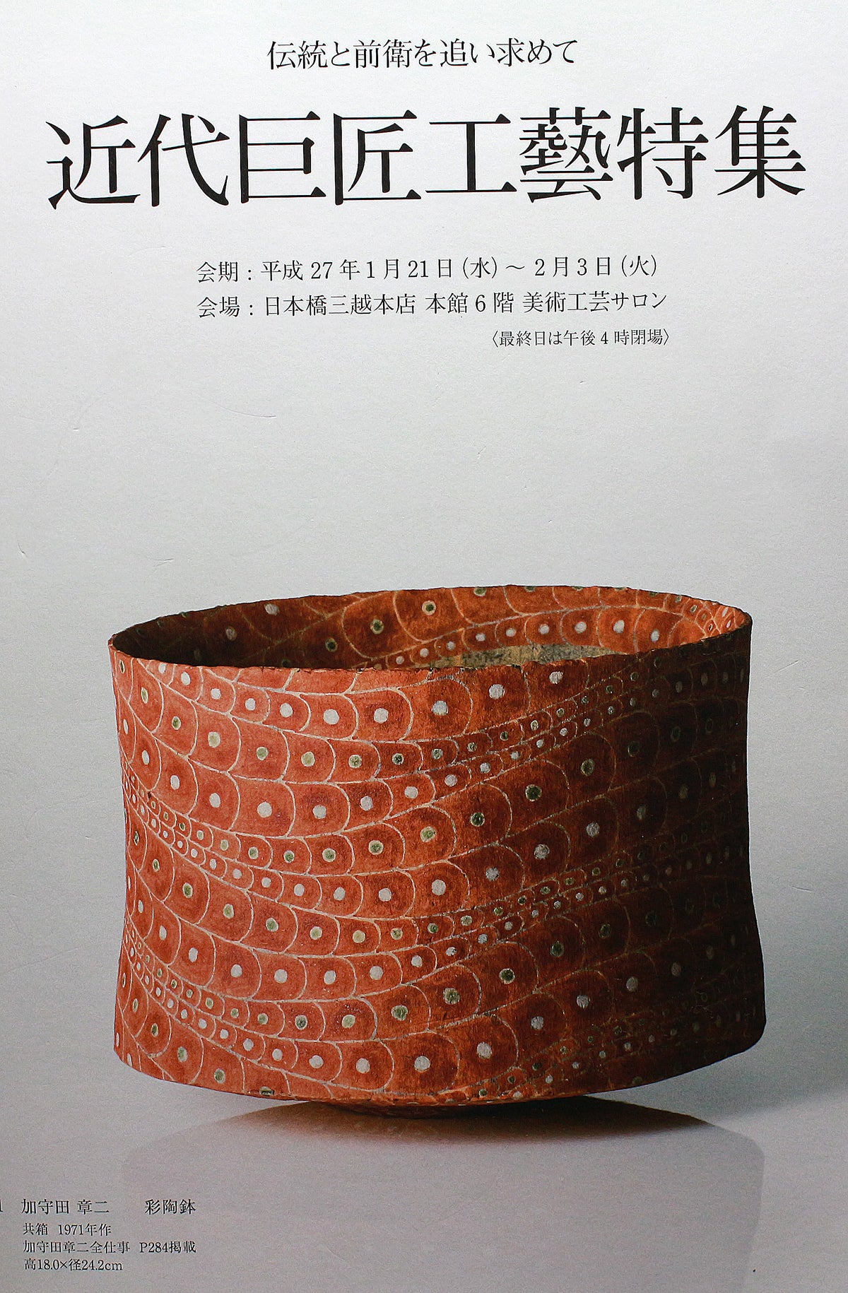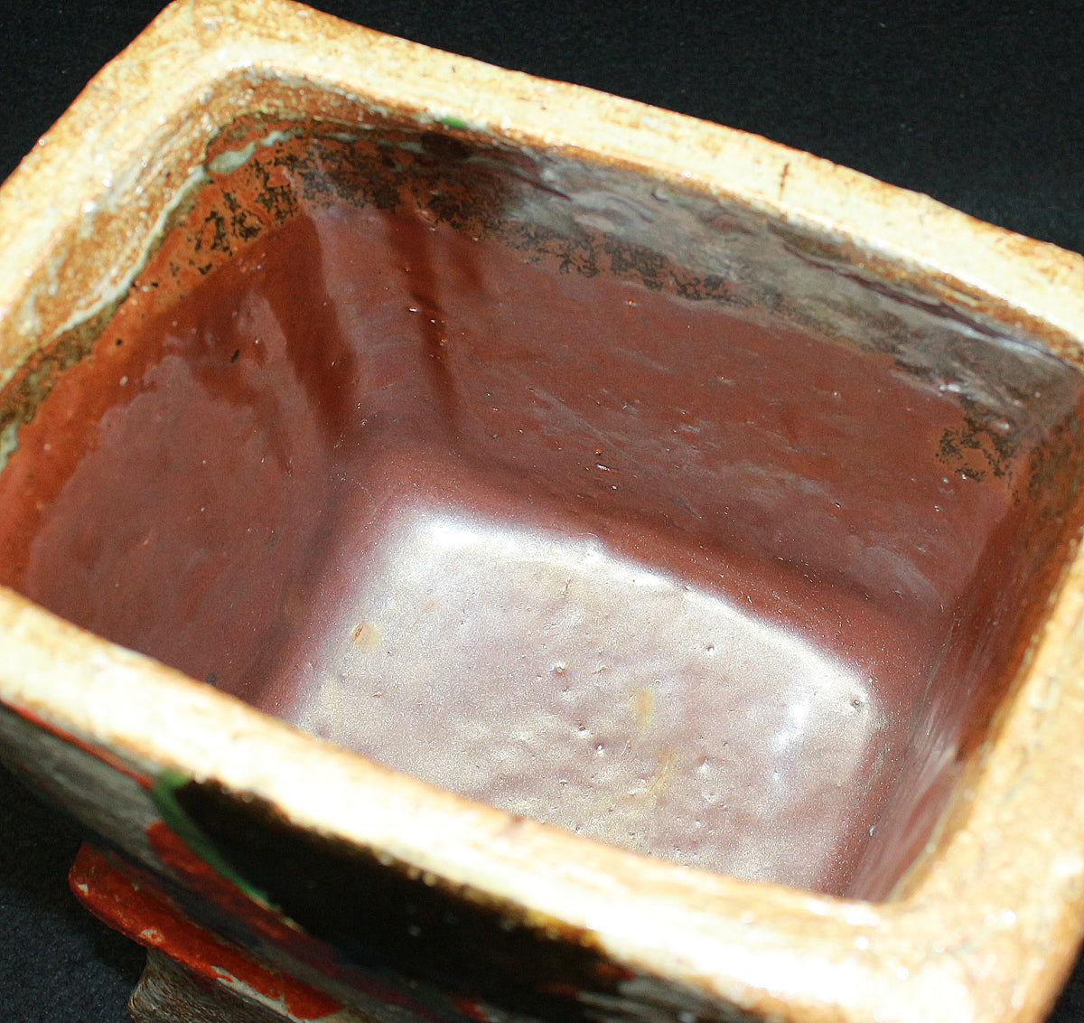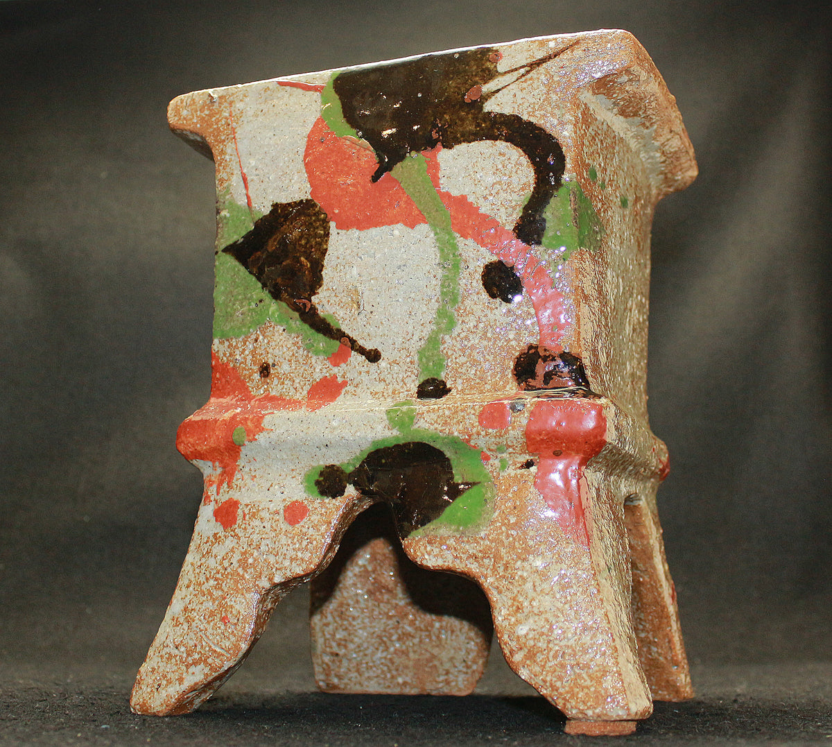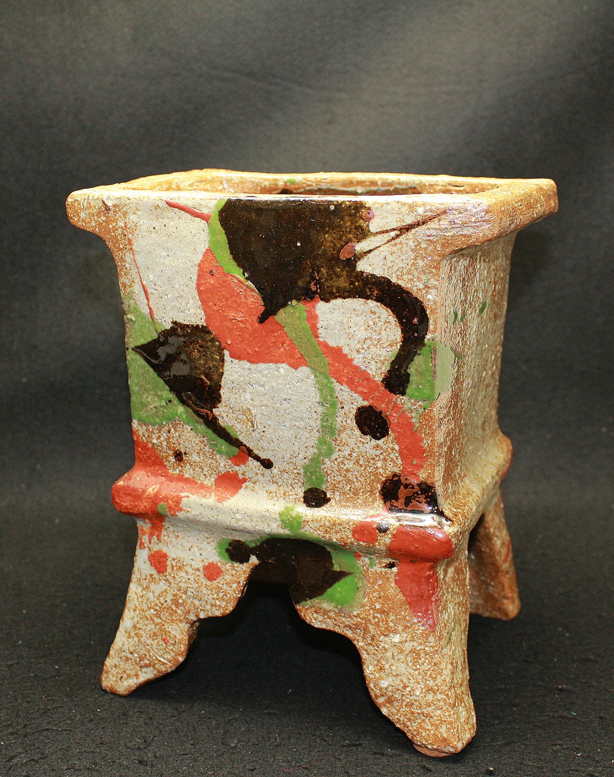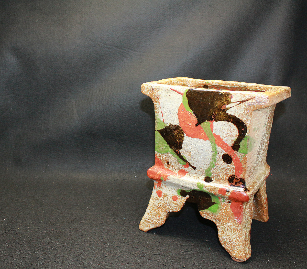 日本民藝界を代表する柳宗悦、浜田庄司、また日本近代工芸を代表する富本憲吉、黒田辰秋など現在までその名が語り継がれる巨匠らと共に日本民藝界の礎を築きその中心人物として活躍。 「用の美」を追求した重厚かつ素朴な作風で近代陶芸の新境地を開拓しミラノ国際展大賞受賞など世界的にも評価の高い日本民芸界を代表する巨匠 河井寛次郎。 本作は寛次郎による抜群の造形美と目が覚めるような発色を持つ赤・黒・緑の三色を打つ掛けた名品である。