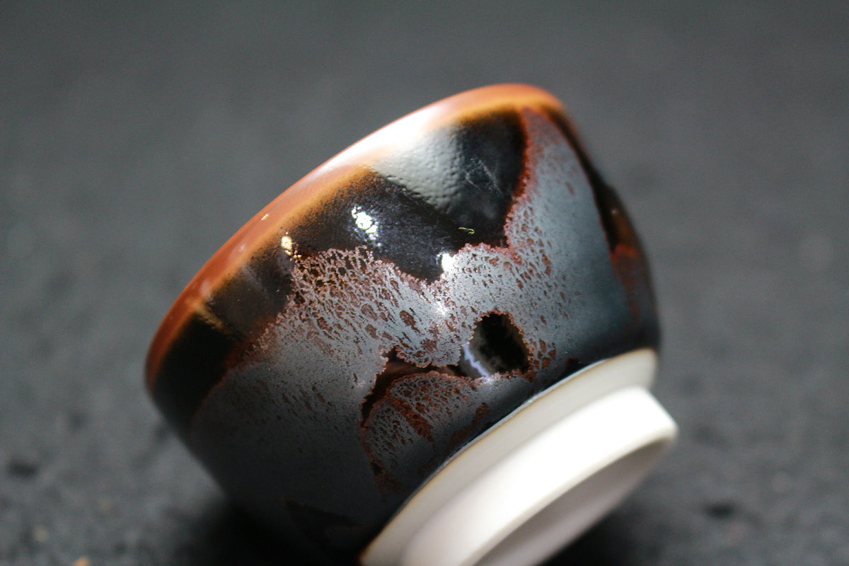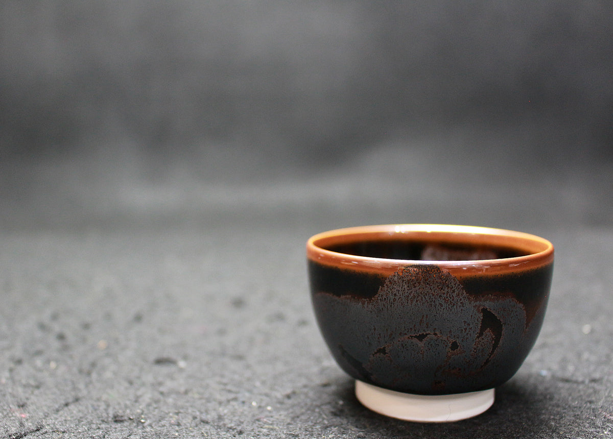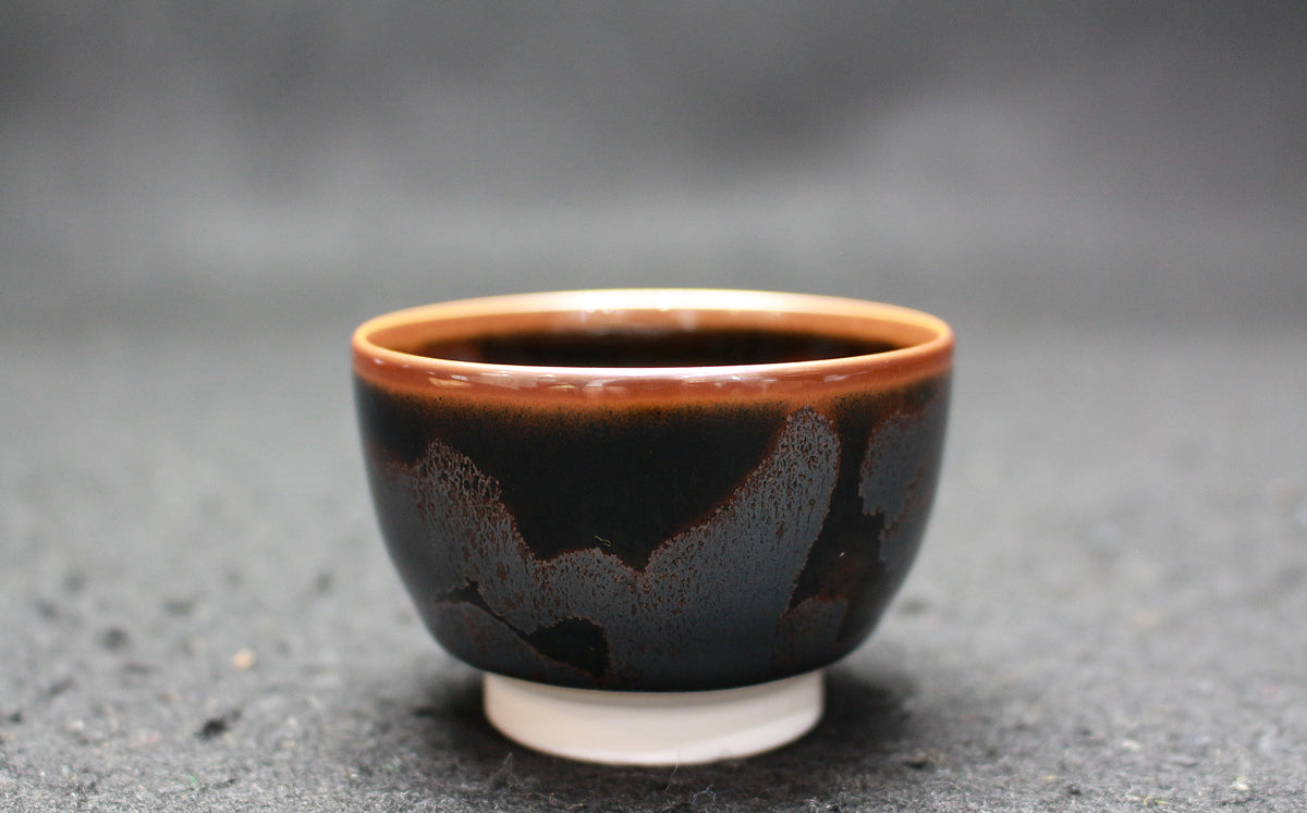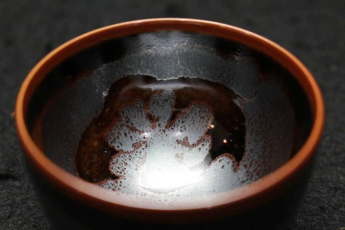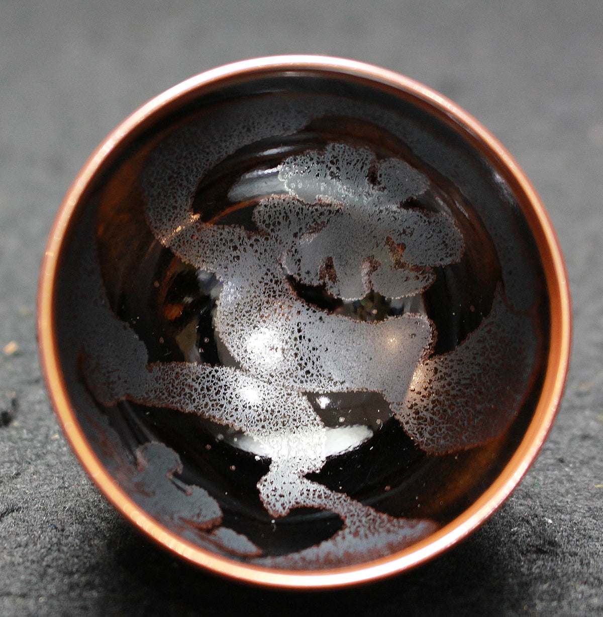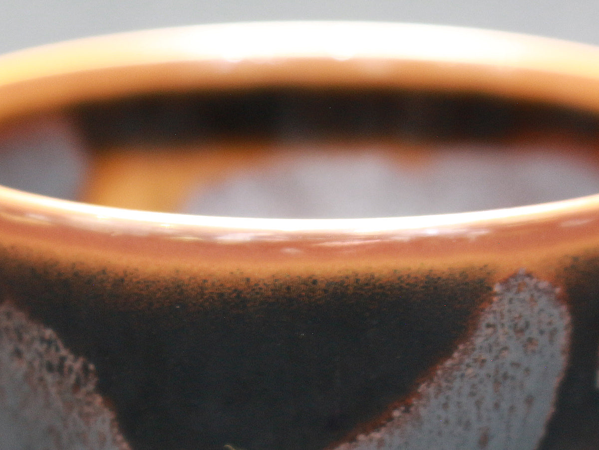 天目技法是指在陶器表面涂抹黑色或深棕色铁釉,然后进行烧制。根据釉层厚度、涂抹方法和烧制条件的不同,可以呈现出不同的颜色和色调。典型的例子包括镜目天目、洋变天目和祓目天目。