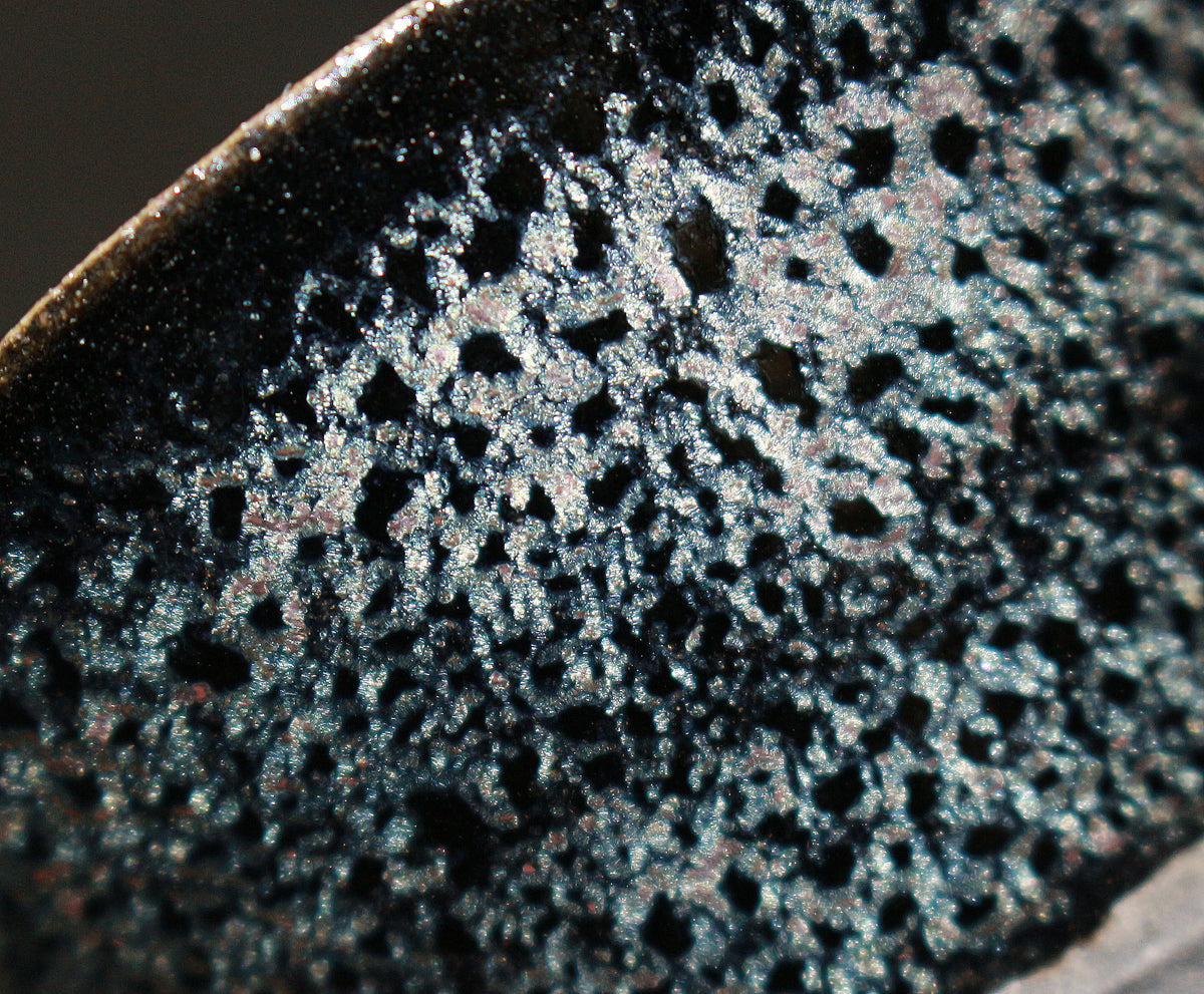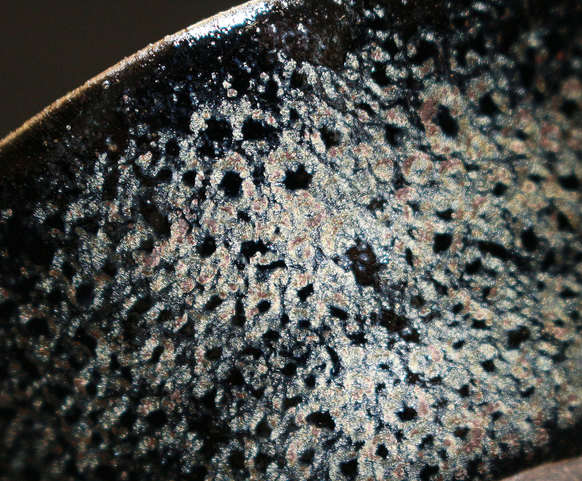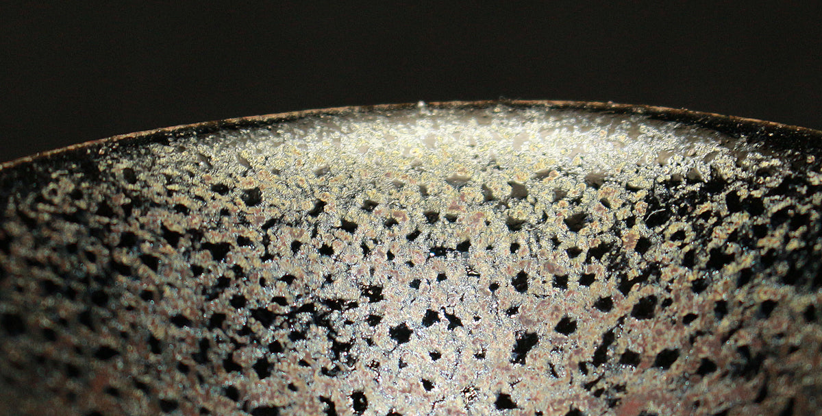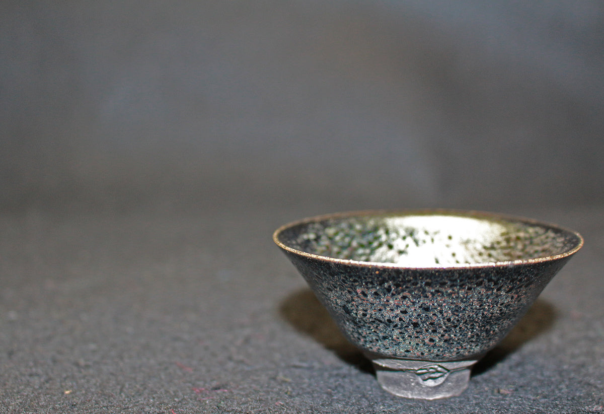「蓬莱燿」と名づけられた本作、見込みから口縁に広がる幻想的な景色が特徴的で、手が切れるかような鋭い薄作りの造形と蓬莱燿独特の煌く粒が見事に揃い抜群の出来栄えを誇る最高傑作。 清水卯一先生を語る上でマストピースとなる本作は、盃に生命が宿り幻想的な至極の逸品として代々後世に伝えられるべき作品で、「蓬莱(蓬莱窯)」の「燿(かがやき)」を放つ酒器として日本陶芸史に輝きを与え続ける大名品。
