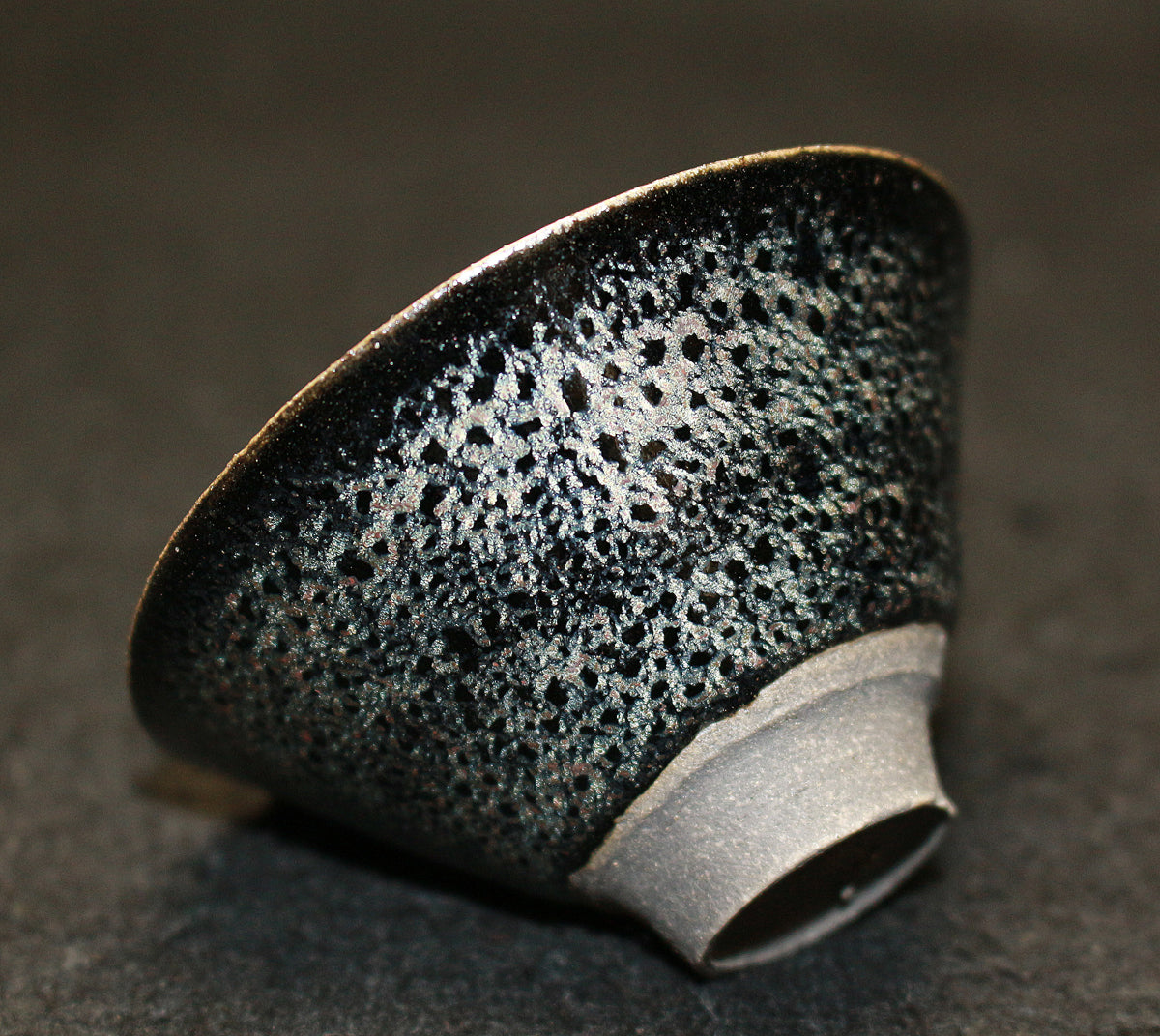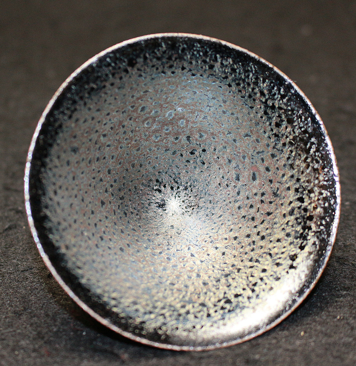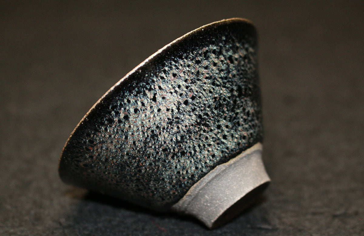 「蓬莱燿」と名づけられた本作、見込みから口縁に広がる幻想的な景色が特徴的で、手が切れるかような鋭い薄作りの造形と蓬莱燿独特の煌く粒が見事に揃い抜群の出来栄えを誇る最高傑作。 清水卯一先生を語る上でマストピースとなる本作は、盃に生命が宿り幻想的な至極の逸品として代々後世に伝えられるべき作品で、「蓬莱(蓬莱窯)」の「燿(かがやき)」を放つ酒器として日本陶芸史に輝きを与え続ける大名品。